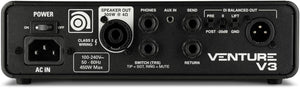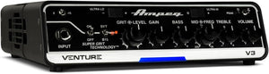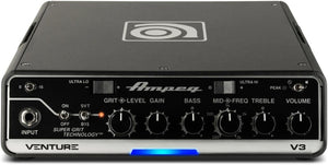 The ultra-portable 300-watt Venture V3 is the smallest and lightest of the three heads in the Venture Series and easily fits into a gig bag, a laptop bag, or the optional Venture carrying bag, making it an excellent choice for the travelling bassist. Its Class D power section provides more than enough power to drive any of the Venture Series speaker cabs or practically any other cab bassists may encounter while touring.
