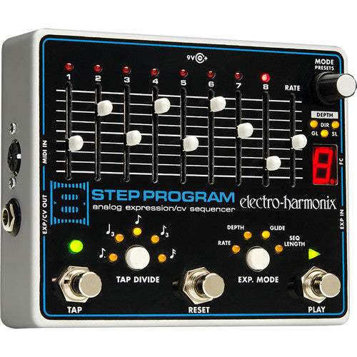 The EHX 8-Step Program Analog Expression/CV Sequencer connects to another device and delivers sequencer control over parameters that respond to expression pedals or CV generators like oscillators, filters, delay parameters, you name it. Set your tempo with the Rate slider or Tap Tempo footswitch, or sync to a drum machine or DAW via MIDI clock. Six Tap Tempo Divide modes provide rhythmic diversity. This thing is a tweaker’s delight!