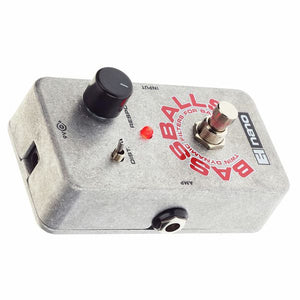 The Nano Bassballs comes in a small, die-cast case with rounded corners, saving valuable pedalboard space. The footswitch selects your original signal or the filtered signal as the Bassballs output. The range of the filters upward sweep in pitch is set by the interaction of instrument volume and the sensitivity control. Both stronger attacks and higher (clockwise) control settings increase the sweep range. Low volume and low sensitivity settings will create little or no sweep, and Bassballs will only provide a small boost in its lowest frequencies. In its upward position, the fuzz switch introduces additional harmonic enrichment that accentuates the filters action. The sensitivity pot also serves as a volume control for the fuzz, also increasing in the clockwise direction.