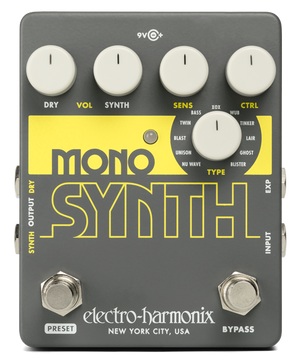 The EHX Mono Synth transforms your guitar into eleven great sounding synthesizers… from vintage synth emulations to fat, stacked voices to soaring lead sounds and more.