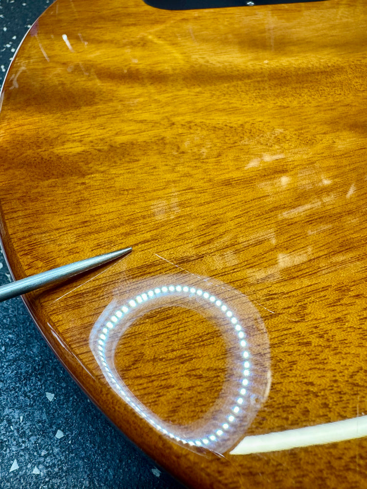 This guitar is a rental return and has been very lightly used. The body looks great. There is a fine scratch on neck pickup and some minor marks on the back. Discounted accordingly. All signs of previous use have been photographed.