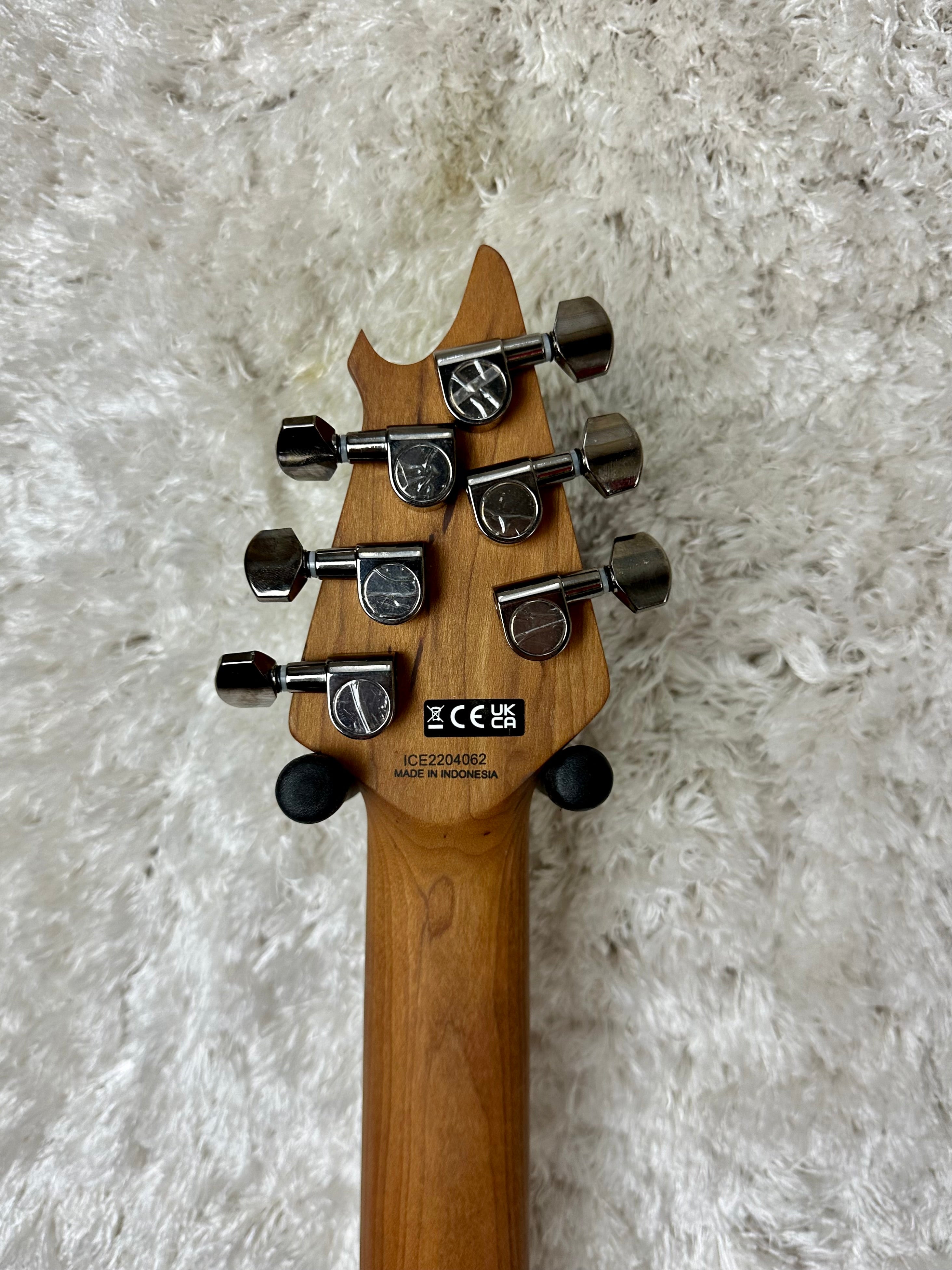 Offering many of the blazing features as its more expensive brethren, this axe features a basswood body with special “comfort cut” forearm contour for maximum playing ease, along with attractive masked-off natural body binding and an elegant quilt maple top. Its bolt-on baked maple neck with graphite-reinforcement rods holds strong against the ravages of temperature and humidity, while a conveniently located spoke wheel at the base of the neck makes for quick and painless truss rod adjustments. Designed for comfortable playability and speed, the Wolfgang WG Standard also features a smooth oiled finish on the back of the neck and a 12”-16” compound radius baked maple fingerboard with rolled edges, 22 jumbo frets and black dot inlays.