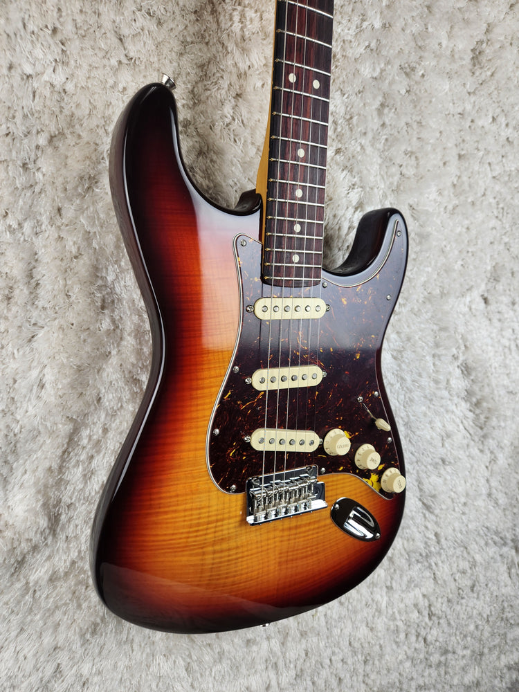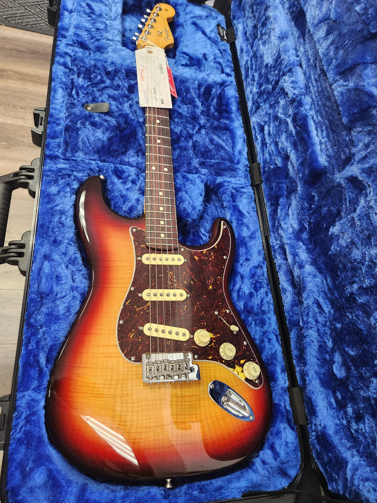 Take your playing to new heights with the 70th Anniversary American Professional II Stratocaster. The alder body, stunning flame maple top and Comet Burst finish exude elegance and class. Equipped with 70th Anniversary V-Mod II Single-Coil Strat® pickups, this guitar delivers dynamic and expressive tones. The Deep "C" neck features smooth rolled fingerboard edges, "Super-Natural" satin finish and sculpted neck heel for a supremely comfortable feel and easy access to the upper register. An upgraded 2-point tremolo with a cold-rolled steel block increases sustain, clarity and high-end sparkle. Deluxe locking tuners ensure exceptional tuning stability. The American Pro II Stratocaster delivers instant familiarity and sonic versatility you'll feel and hear right away, with broad ranging appointments that add up to nothing less than a new standard for professional instruments. The Inca Silver ABS molded case provides reliable protection for your prized instrument.