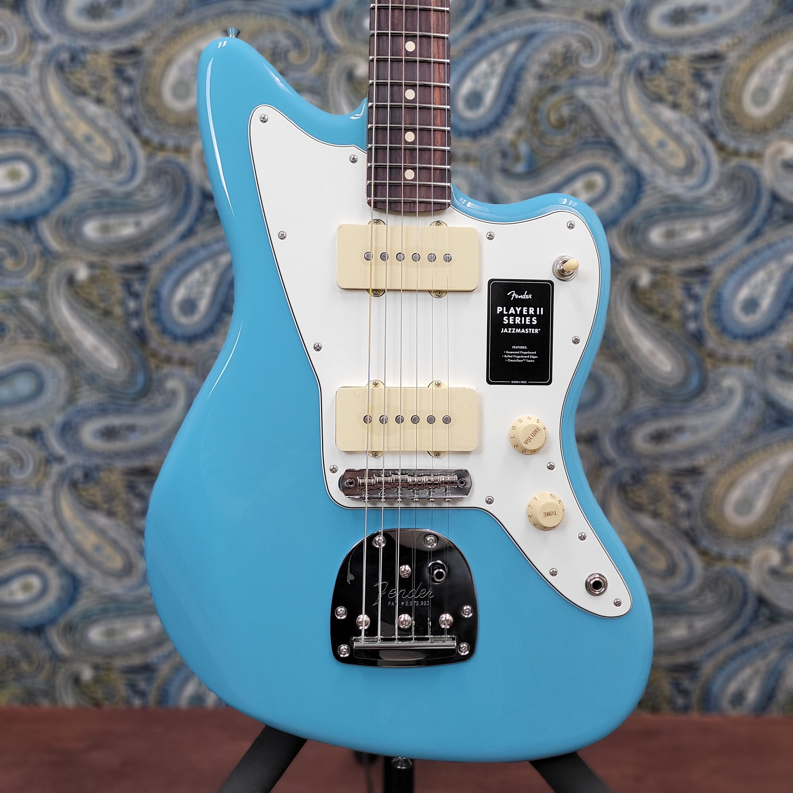 The Player II Jazzmaster radiates timeless Fender charm, but under the hood, it's primed for today's players. Everything about the neck is designed for fast and fluid playability, from the Modern “C”-profile with silky satin urethane finish on the back to the comfy 9.5”-radius slab rosewood fingerboard with smooth rolled edges and 22 medium jumbo frets. A classic alder body is available in both timeless Fender finishes and never-before-seen colors unearthed from the archives. Player Series Alnico V Single-Coil Jazzmaster pickups offer crystalline highs, musical mids and tight lows that elevate any genre. The 3-way toggle switch lets you easily dial in everything from glassy neck pickup chime to cutting bridge pickup bite and all points in between, while a 6-saddle Jazzmaster bridge with Floating Tremolo, upgraded Mustang® saddles and ClassicGear™ tuners ensure precise tuning stability for the flexibility to explore endless sonic possibilities.