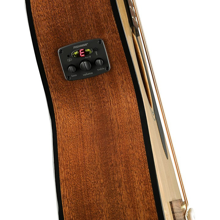 A Fishman Classic Design pickup/preamp system adds peerless amplified performance with a variety of onboard controls to your acoustic instrument without compromising its pure, rich and resonant tone. The built-in tuner is conveniently placed right where you can see it.
