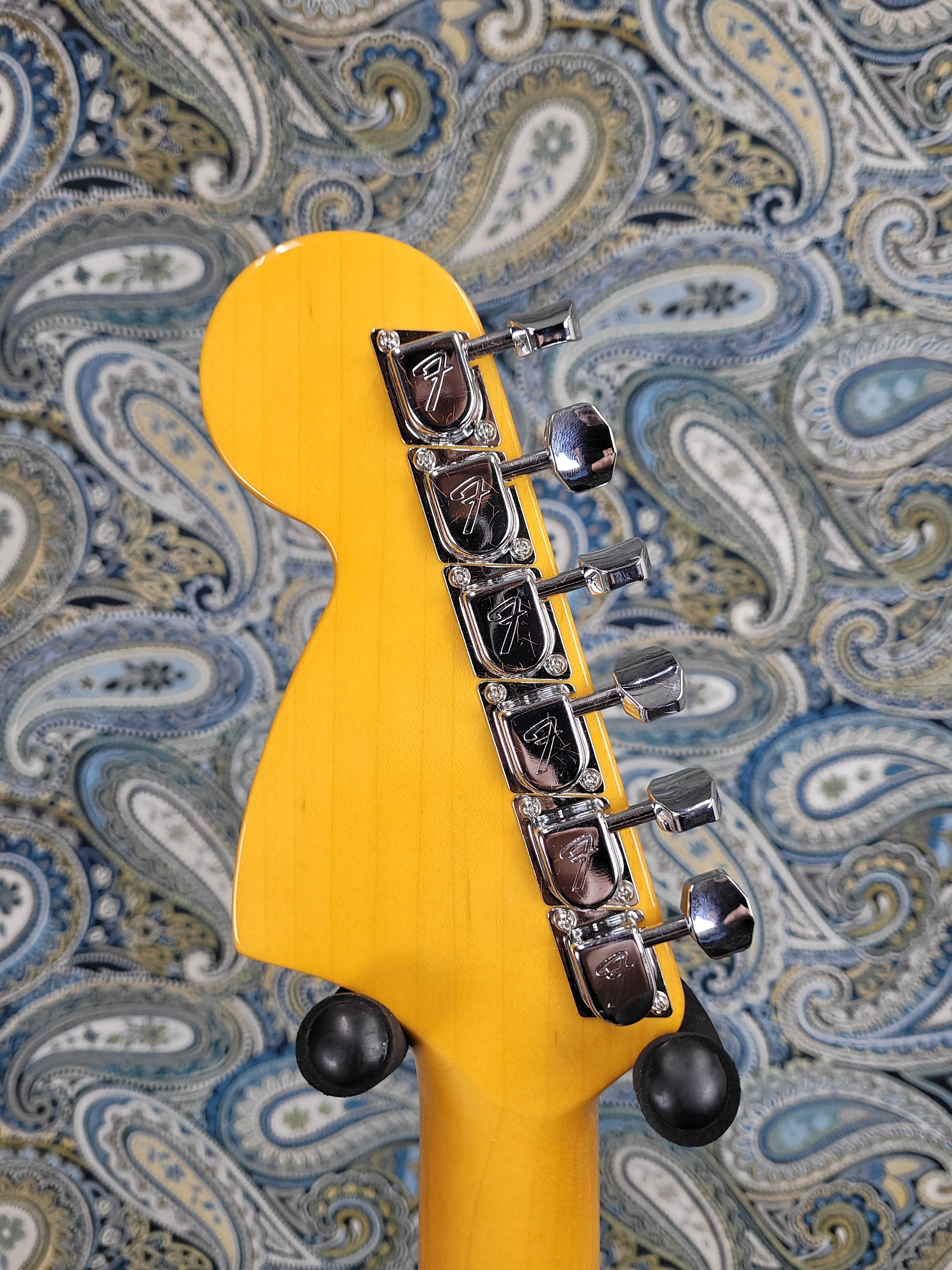 Other vintage-accurate features include a bone nut, black dot inlays, bullet-style truss rod and nut, and a serialized 3-bolt “F” stamped neck plate. It ships strung with Fender® USA 250R Nickel Plated Steel strings (.010-.046) and comes housed in a vintage-style black case with orange plush interior, completing the authentic late-Vietnam-era Fender experience.