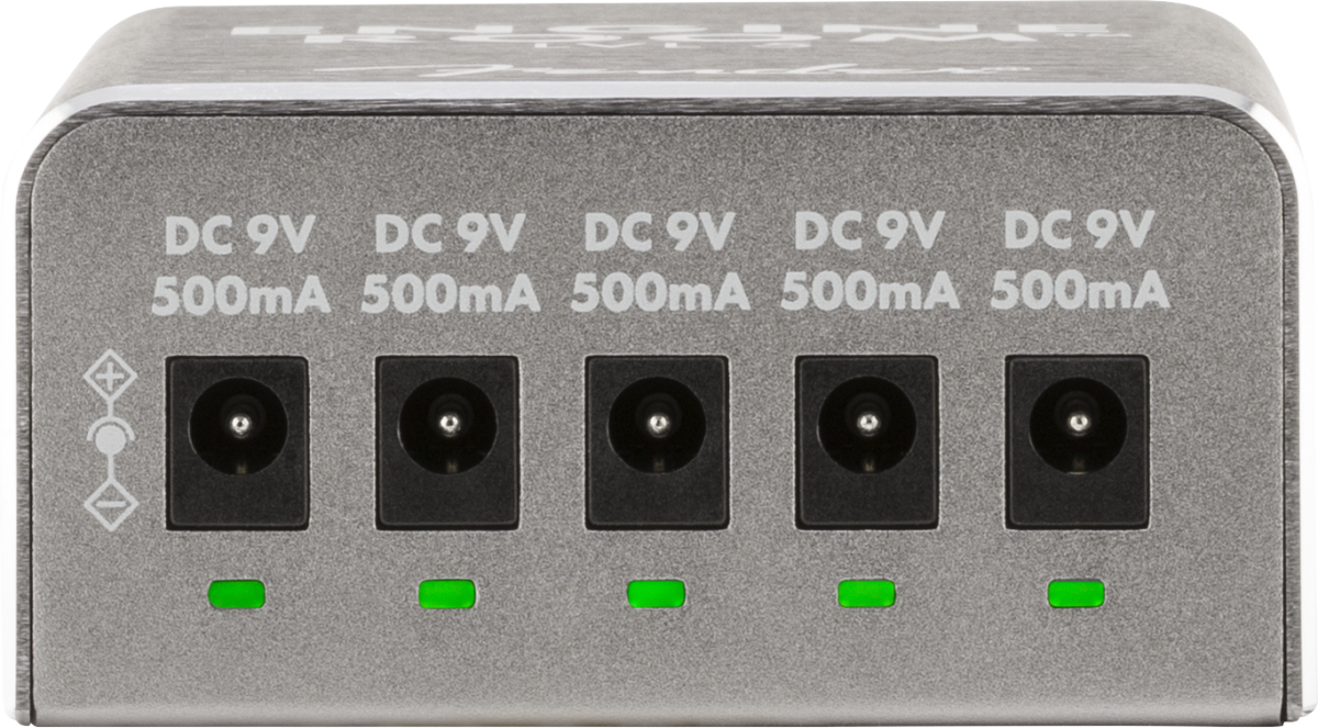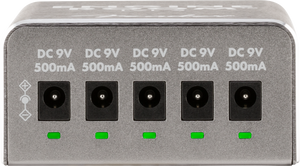 - Pedalboard power supply with 5 isolated 9V DC (500mA) power outputs for clean, reliable power