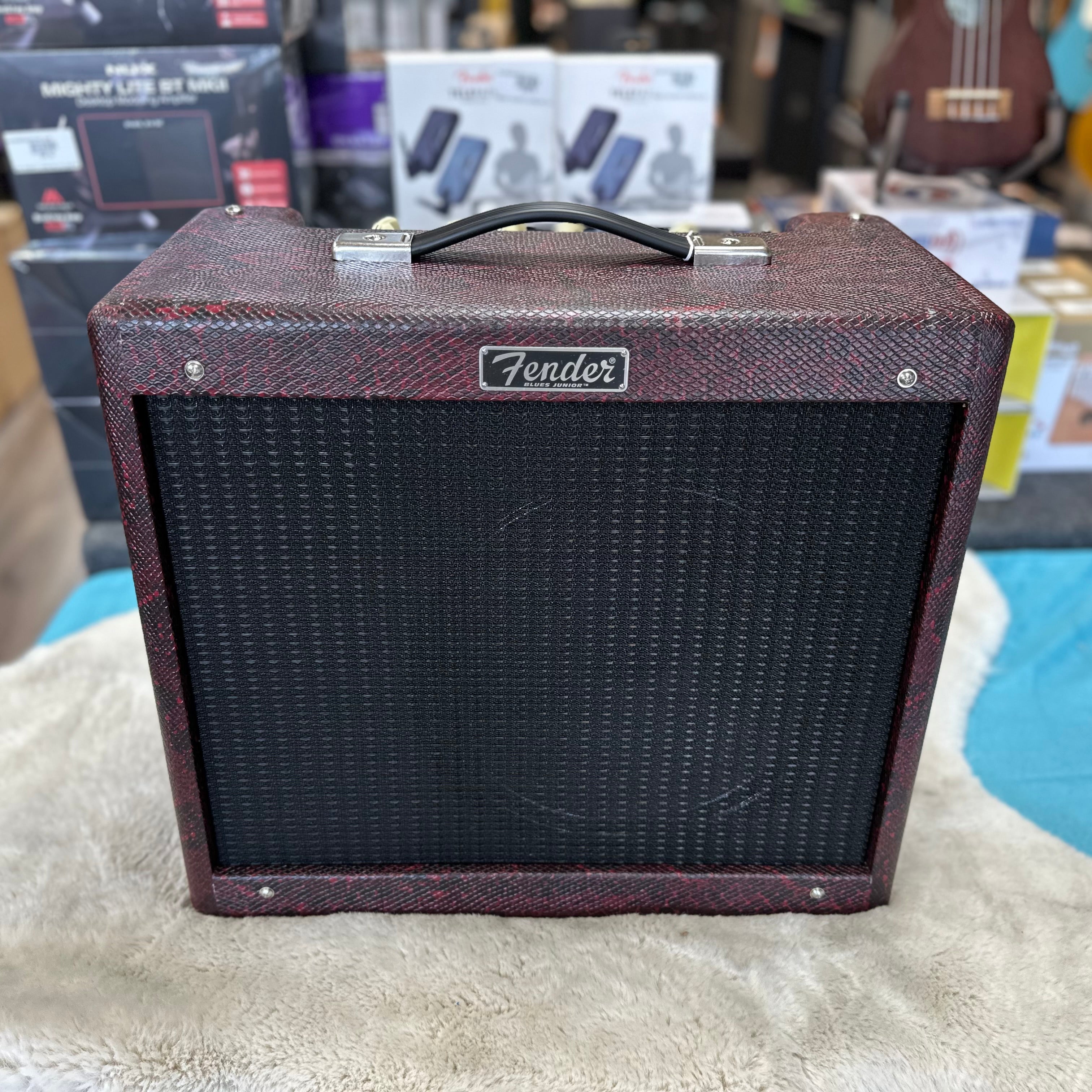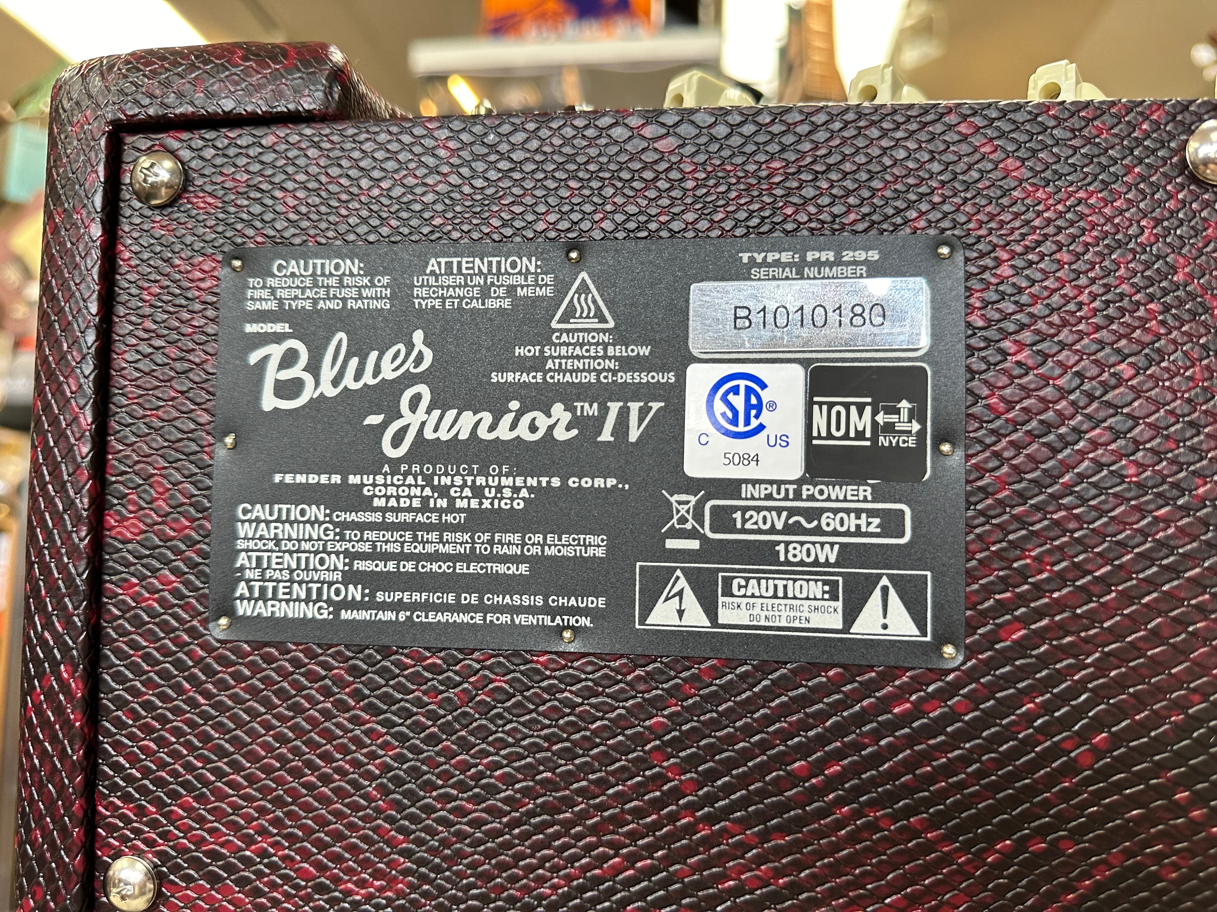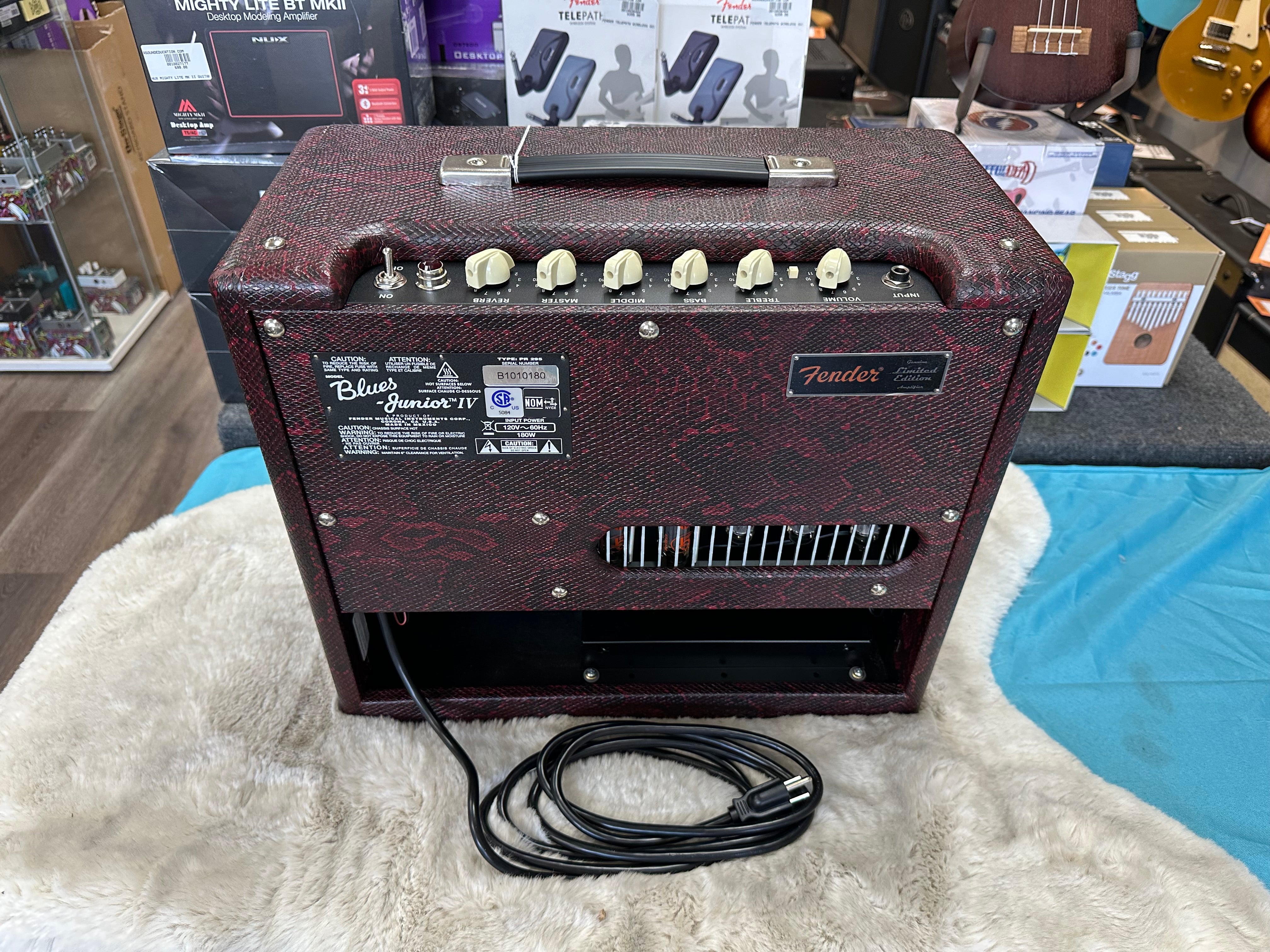 The Fender FSR Blues Junior IV in Red Snakeskin is a compact tube combo that delivers 15 watts of classic Fender tone in a stylish, portable package. This special run model comes loaded with a 12" Eminence Texas Heat speaker, providing a bold midrange voice and plenty of headroom for blues, rock, and country players alike. Updated preamp circuitry enhances warmth and clarity, while the refined spring reverb produces smoother, more musical ambience across the dial. The distinctive red snakeskin covering, aged silver grille cloth, ivory control knobs, and steel-reinforced handle give this amp a striking stage presence, while its simple controls and pedal-friendly design make it a practical workhorse for gigs, rehearsals, or the studio. With its combination of refined tone, portability, and standout looks, the Blues Junior IV FSR is built for guitarists who want character and performance in a grab-and-go amp.