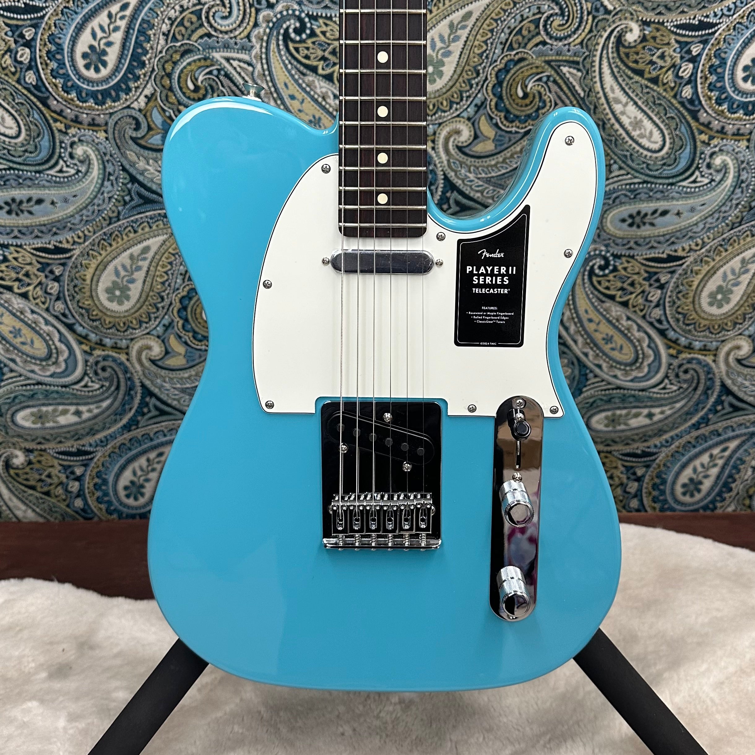 The Player II Telecaster radiates timeless Fender charm, but under the hood, it's primed for today's players. Everything about the neck is designed for fast and fluid playability, from the Modern “C”-profile with silky satin urethane finish on the back to the comfy 9.5”-radius slab rosewood or maple fingerboard with smooth rolled edges and 22 medium jumbo frets. Choose from alder, chambered ash or chambered mahogany bodies available in both classic Fender finishes and never-before-seen colors unearthed from the archives. Player Series Alnico V Single-Coil Tele® pickups offer crystalline highs, musical mids and tight lows that elevate any genre. The 3-way blade switch lets you dial in everything from smooth neck pickup chime to cutting bridge pickup twang and all points in between, while a 6-saddle bridge, block steel saddles and ClassicGear™ tuners ensure precise tuning stability for the flexibility to explore endless sonic possibilities.