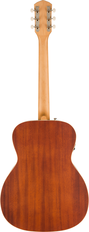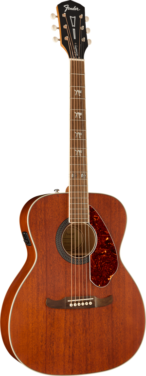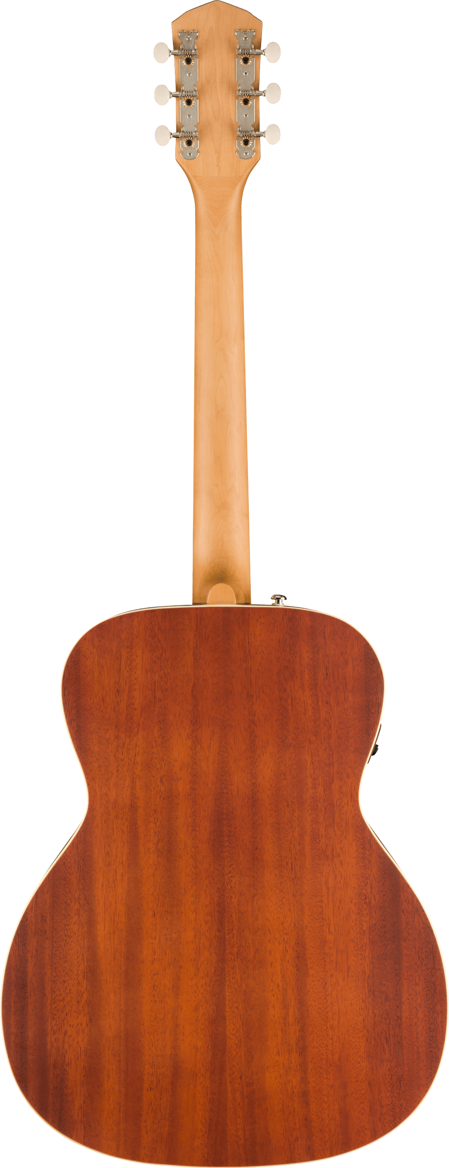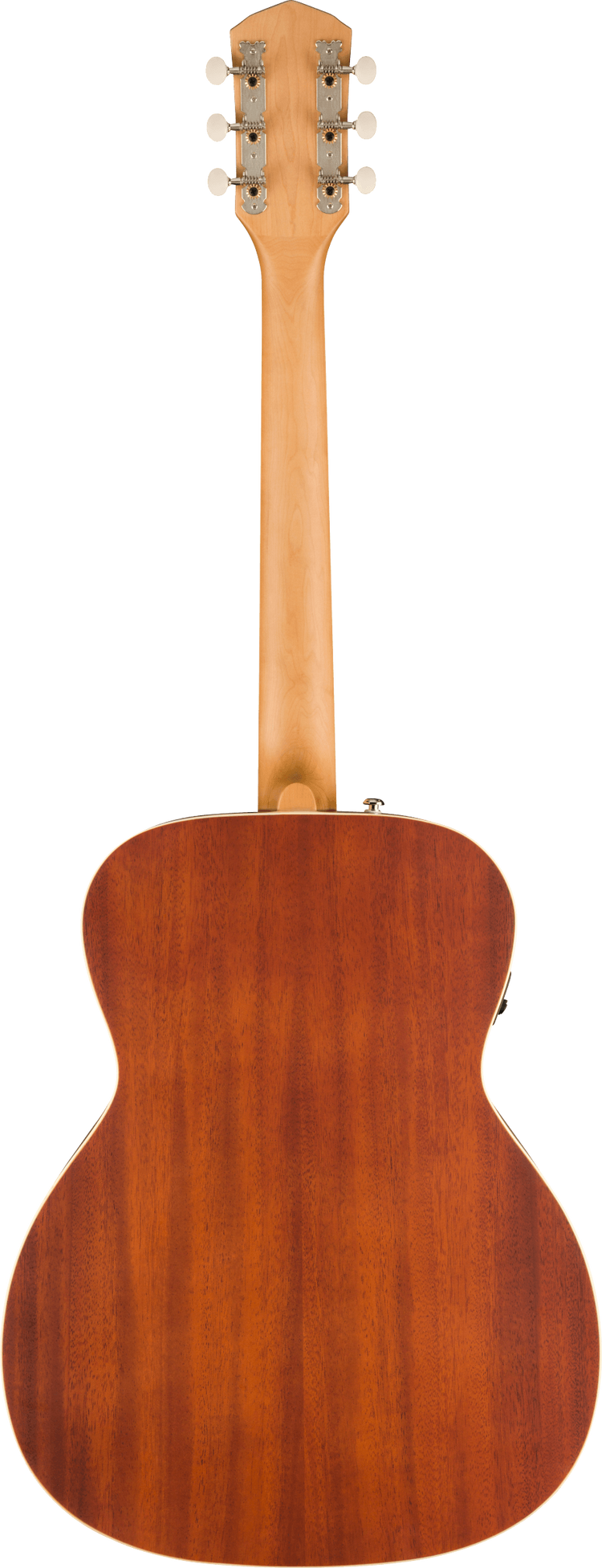 - Natural-finish solid mahogany top with scalloped "X" bracing, mahogany back and sides