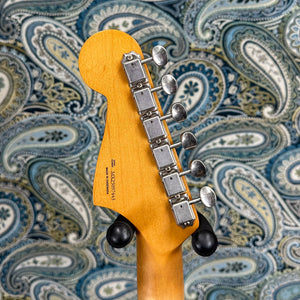 Featuring a variety of vintage colors finished in Road Worn® aged nitrocellulose lacquer, the Vintera® II Road Worn® '50s Jazzmaster® recreates the look and feel of a well-played classic. The ‘50s “C”-shape maple neck with 7.25" radius rosewood fingerboard and vintage-tall frets provides supreme comfort and outstanding feel. Under the hood, you'll find a pair of vintage-style '50s single-coil pickups that deliver all the sweet and sparkling, warm and woody tone that made Fender® famous. Other features include a vintage-style floating tremolo for expressive vibrato and vintage-style tuning machines for enhanced tuning stability.