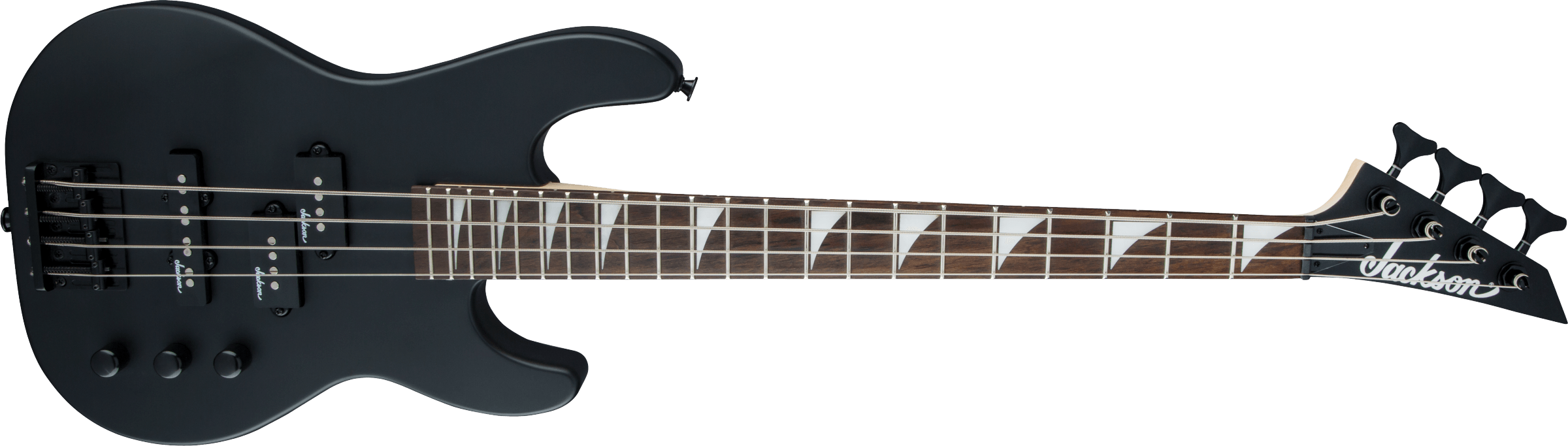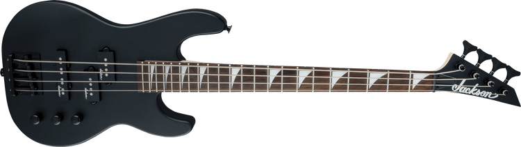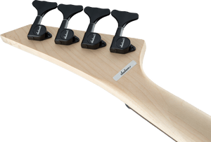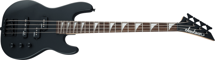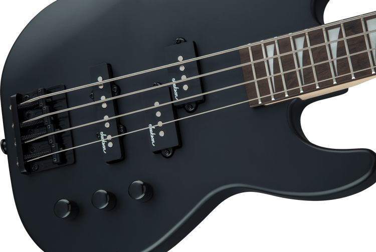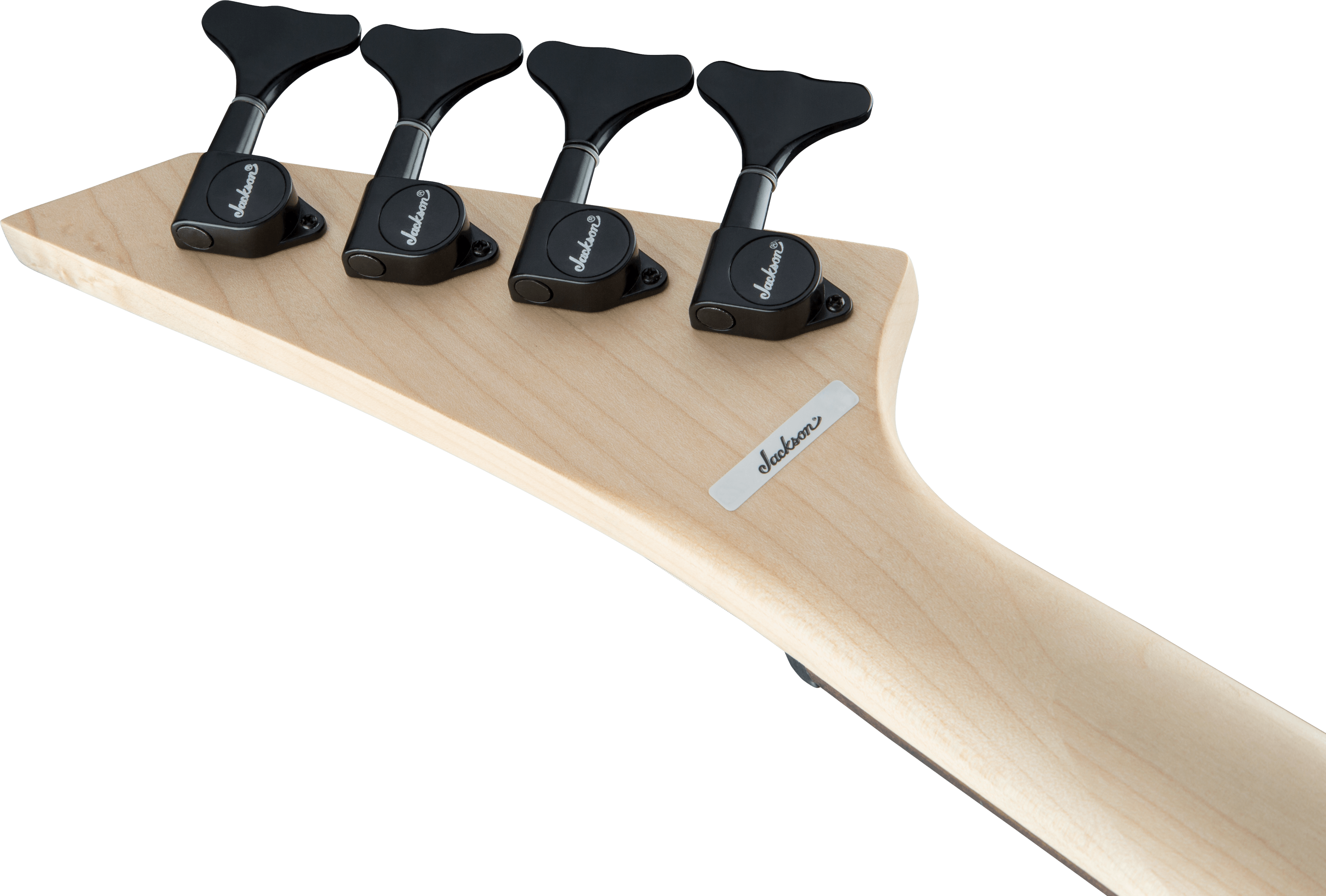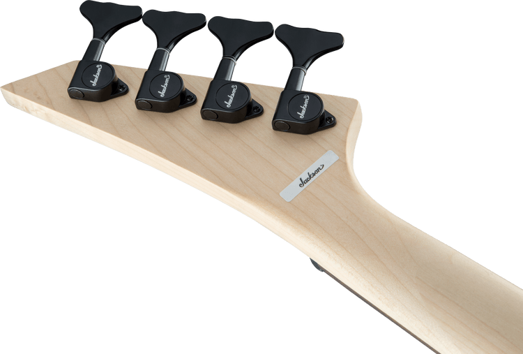 A Jackson P style neck pickup and Jackson J style bridge pickup power this 4-string bass, which also features a pair of volume knobs, single tone knob, hardtail bridge with black base plate and Jackson-branded tuners.