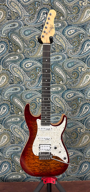 "The perfect boutique double-cut for today's player. The body is swamp ash with a highly figured quilt maple top, we then perfect the body with the addition of real flame maple binding. The maple neck has a rosewood fingerboard with a compound radius, this is made for today's more complex playing requirements.