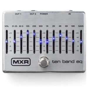 Use the MXR Ten Band EQ Pedal for precision control over your guitar or bass tone. Featuring 10 EQ sliders, with carefully selected frequencies and +/-12dB boost/cut range, you can optimize your sound in any room or recording session. Additional Volume and Gain sliders allow you to use the Ten Band EQ Pedal as an extremely tweakable boost pedal. Dual outputs allow you to feed two amplifiers at once. And 18-volt operation ensures you'll have all the headroom you need, even if you're running a chain of pedals into it. Built with rugged aluminum and featuring true bypass switching, the MXR Ten Band EQ Pedal is a fine addition to any pedalboard.