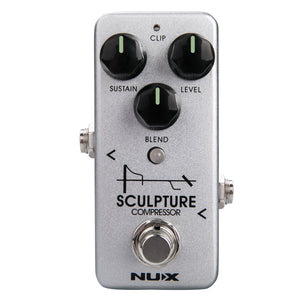 NUX Sculpture Compressor pedal offers a consistent volume output level and sharpens the signals on top and bottom edges. When you start picking your guitar, it will clean the loud (peak) notes and increase the sustain by raising the level of decaying (quiet) notes. Sculpture also contributes to the signal foundation that’s fed into the rest of your effects chain.