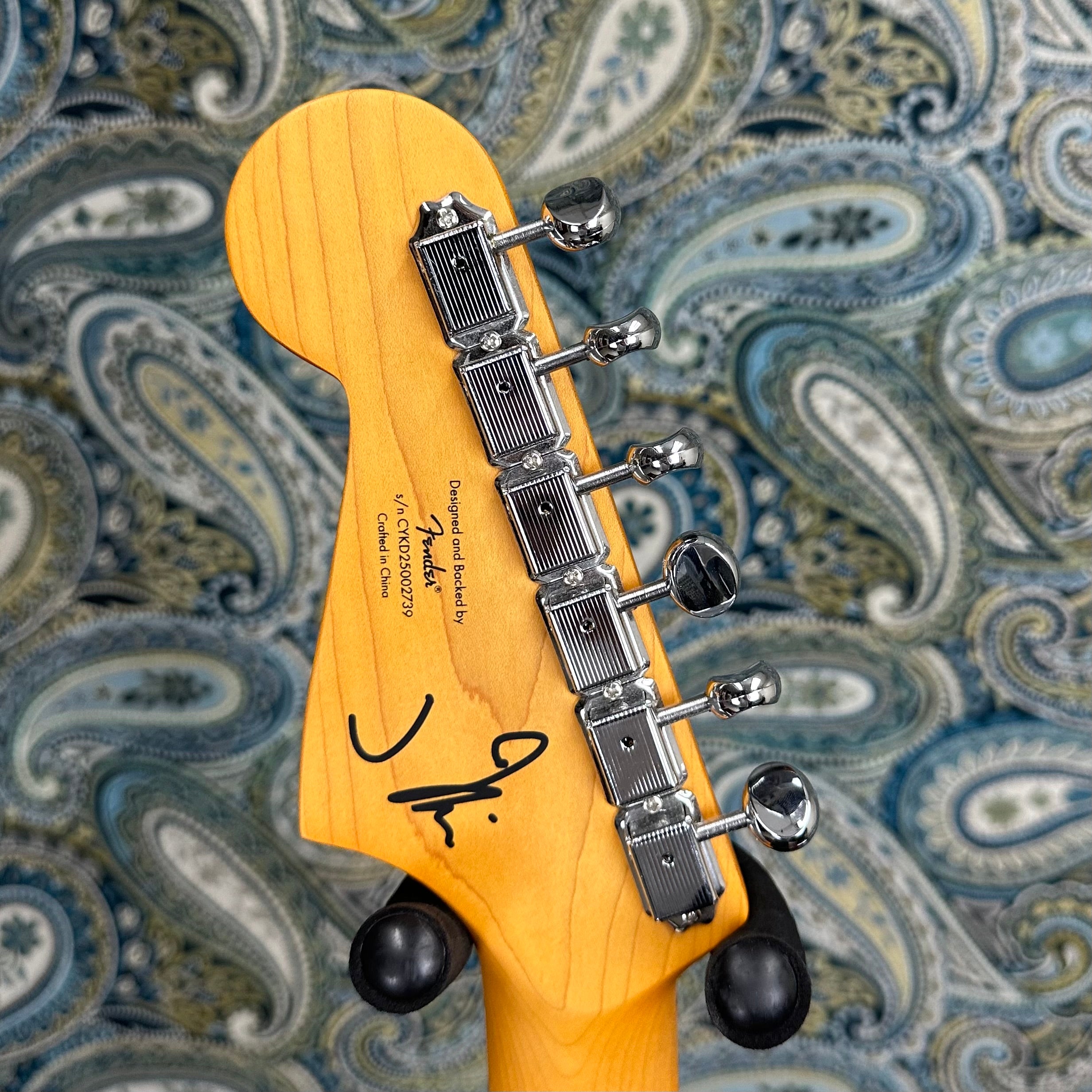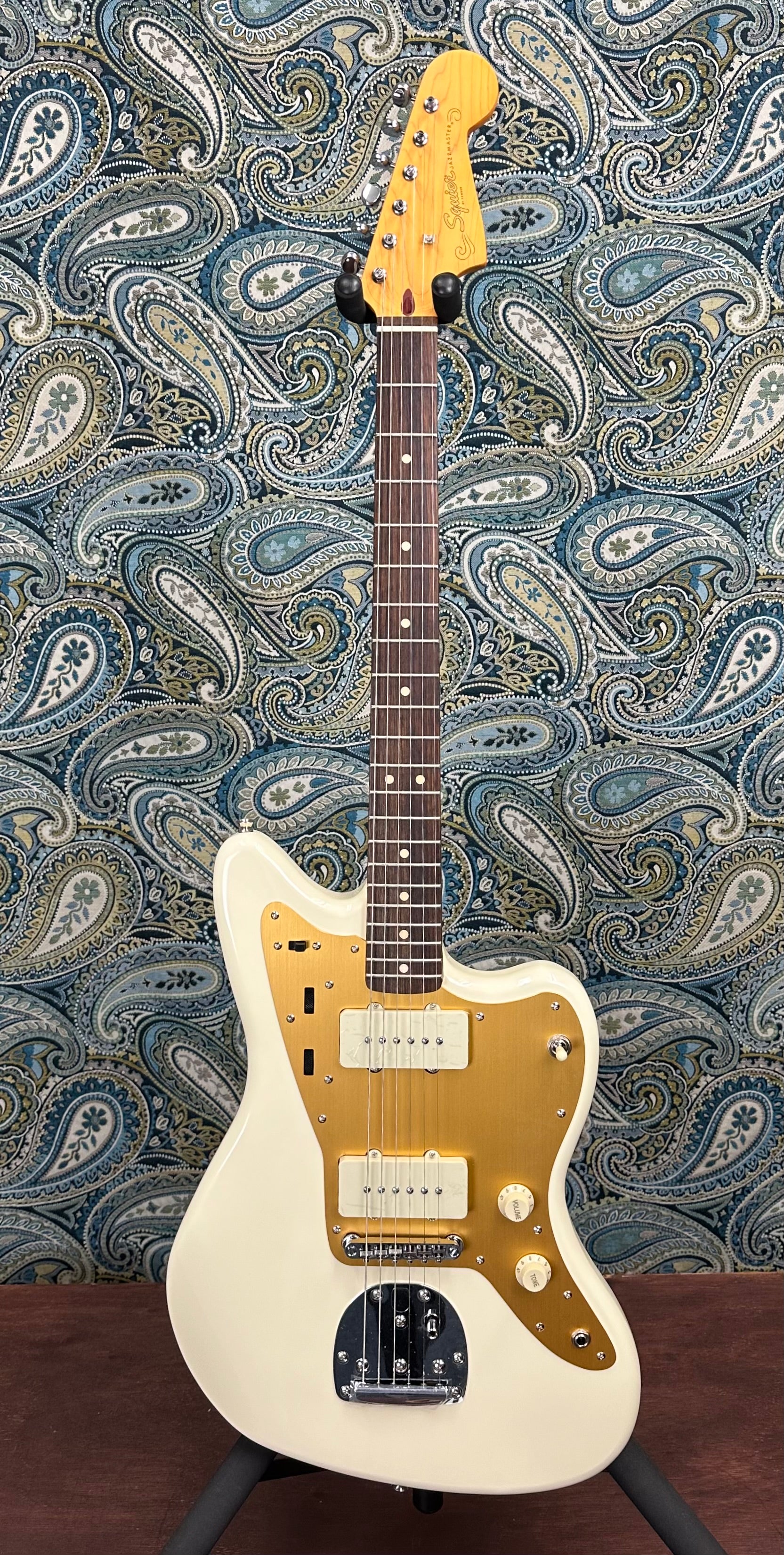 The J Mascis Jazzmaster® features a basswood body, C-shaped maple neck, rosewood fingerboard with 9.5" radius and 21 jumbo frets, two single-coil Jazzmaster pickups with three-position switching and dual tone circuits, gold anodized aluminum pickguard, aged white plastic parts (knobs, switch tip, pickup covers), Adjusto-Matic™ bridge with vintage-style floating tremolo tailpiece, vintage-style tuners, chrome hardware, Vintage White finish and J Mascis signature on the back of the large '60s-style headstock.