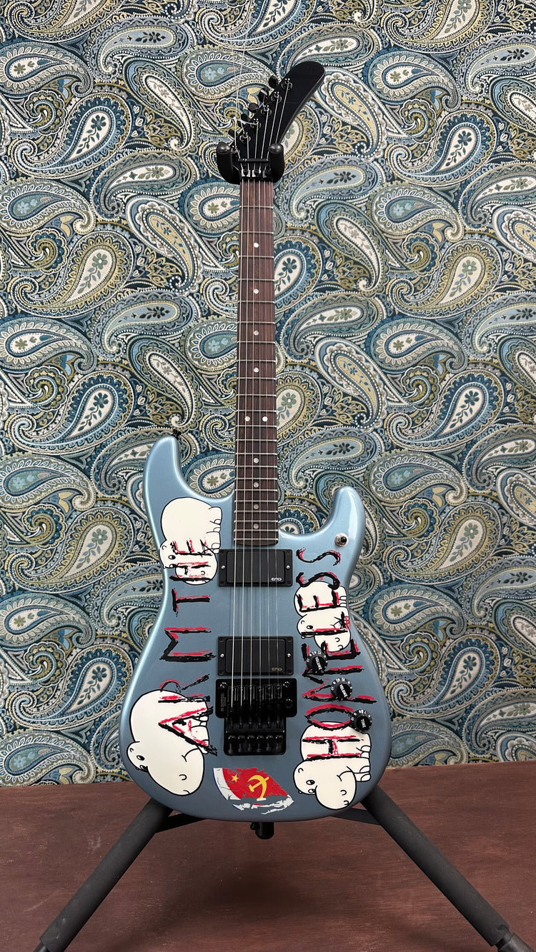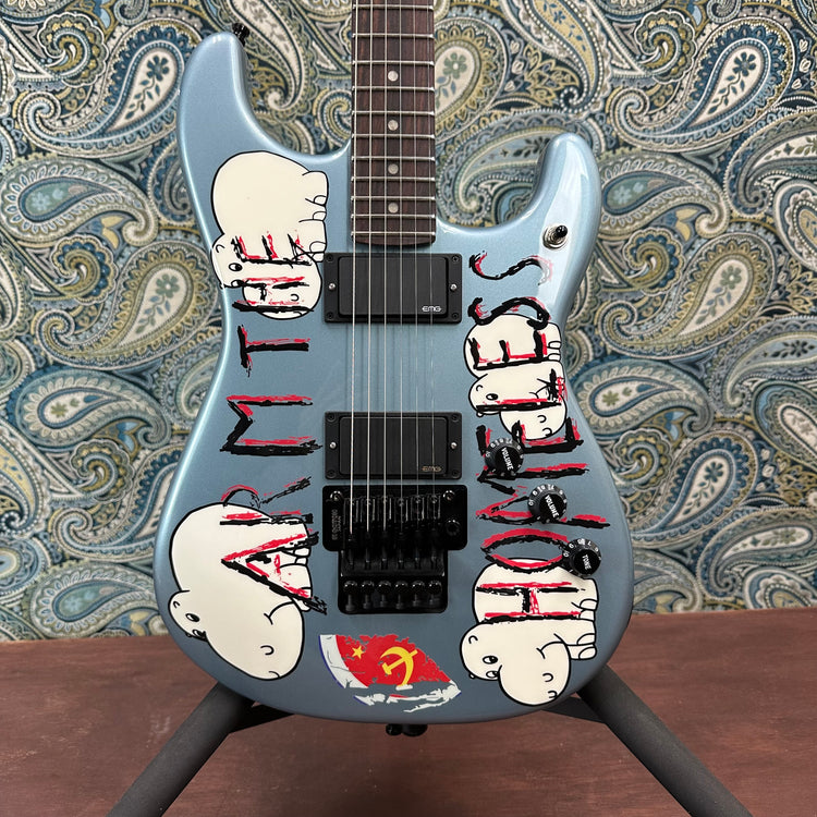 As architect of Rage Against the Machine's groundbreaking sound, Rock 'n' Roll Hall of Famer Tom Morello revolutionized guitar with his monstrous riffs and boundary-breaking techniques. His heavily modified 'Arm the Homeless' guitar became legendary and has been his primary instrument for over 35 years, channeling everything from delicate jazz phrases to searing metal riffs through its distinctive active electronics and Gotoh® double-locking tremolo system. Adorned with its provocative slogan and his own hand-drawn hippopotamus design against its striking blue ice metallic finish, this guitar masters its role as an instrument to become a powerful symbol of artistic rebellion. Every component, including its characteristic hockey stick headstock and powerful visual messaging captures Morello's unwavering commitment to musical innovation and social change.