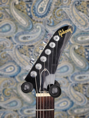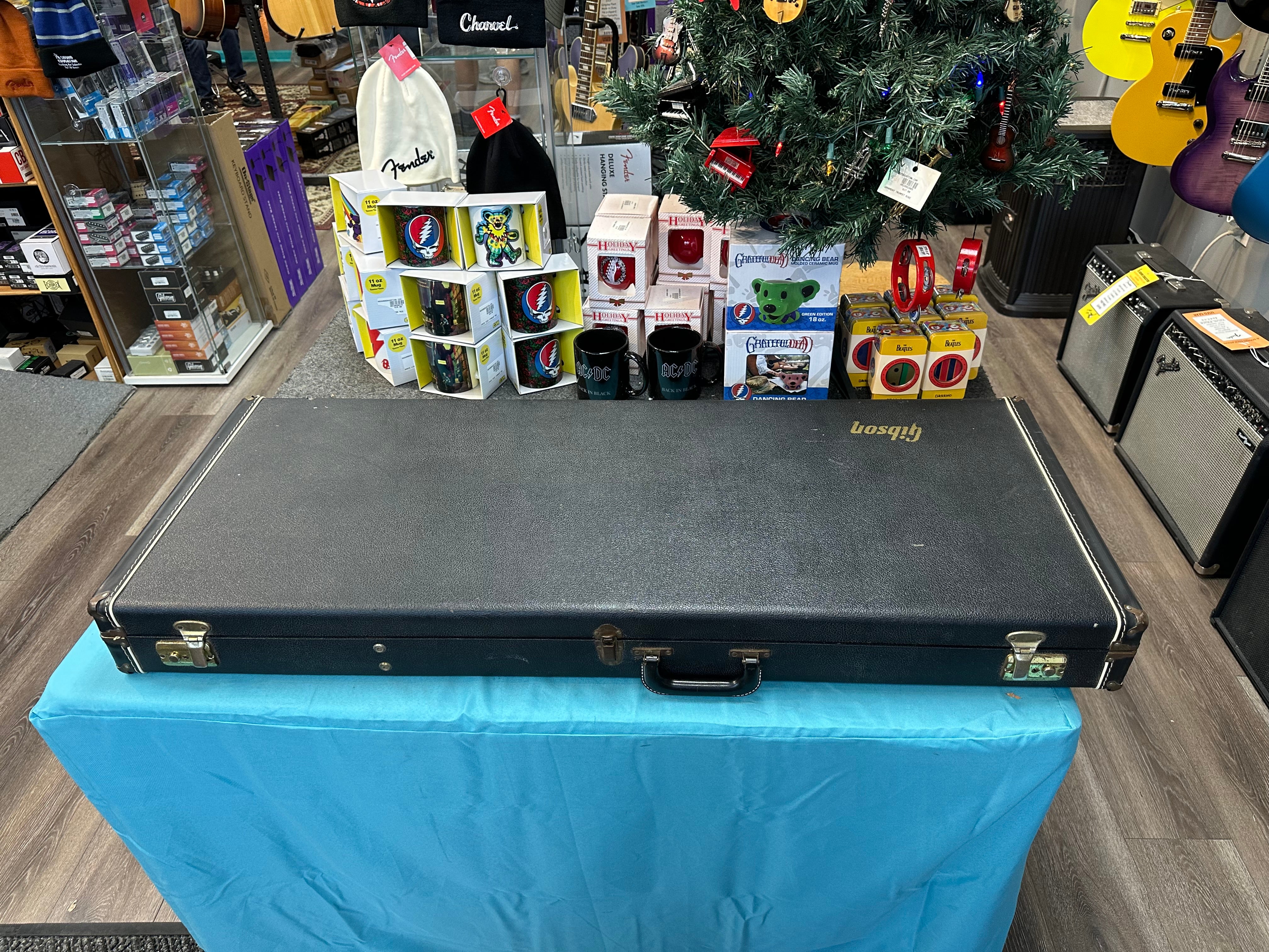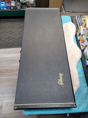 This guitar includes the original hardshell case. It is rather large with a red interior. It has a gold Gibson logo print on the front side.