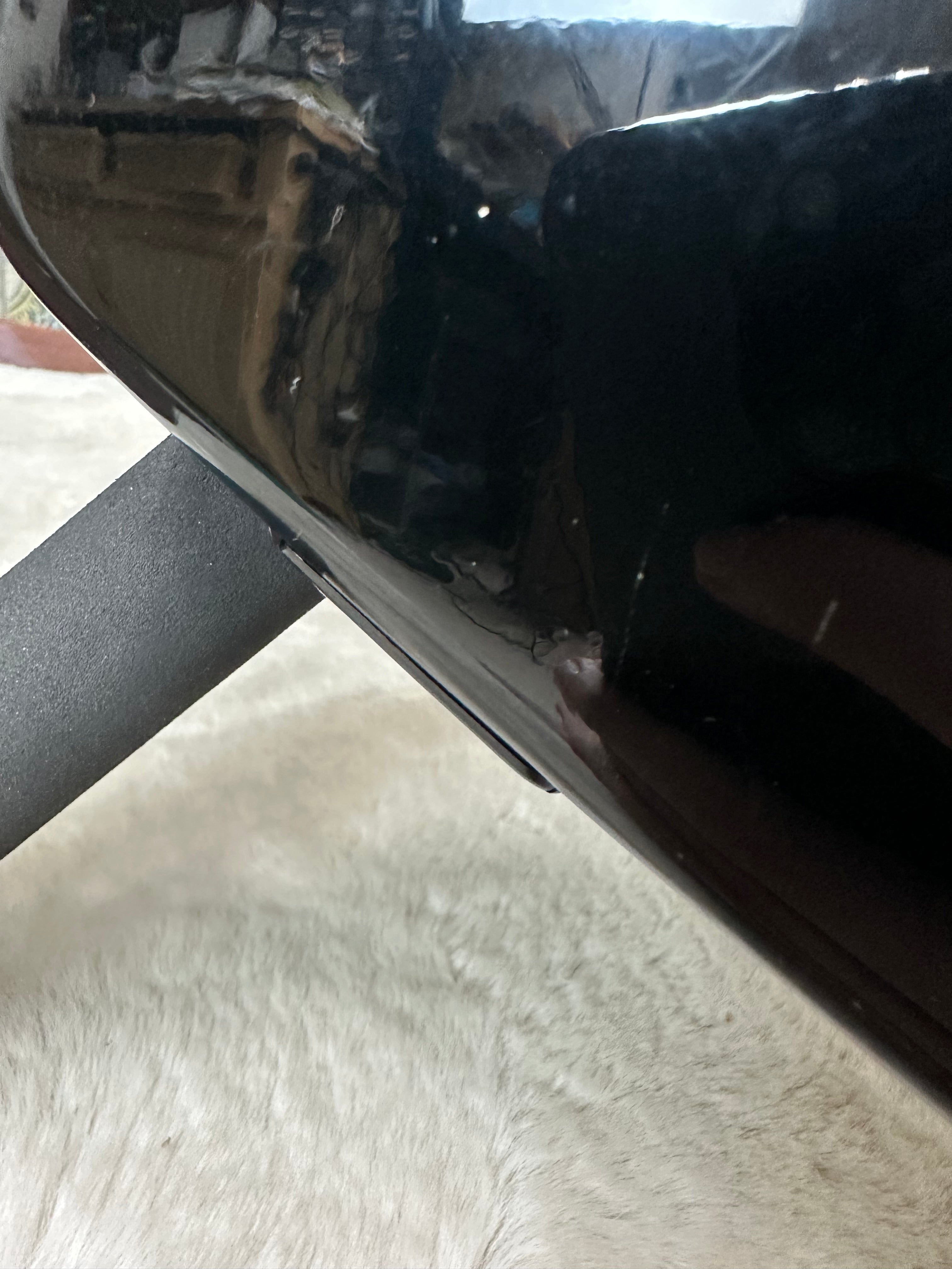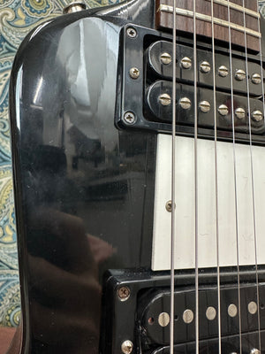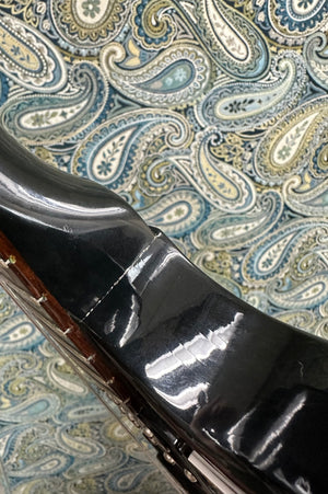 This guitar is in very good condition for it's age. There is general finish wear throughout, including scratches, small dings, and finish checking in certain spots. We did our best to picture these, but due to the high-gloss nitro finish it is somewhat difficult. There is a finish crack at the neck heel that wraps around both sides. Set neck guitars can develop this if you live in a place where there is a great degree of change between seasons. This guitar is structurally sound, nothing to cause concern. On the headstock there are remnants of a sticker. This guitar weighs 7LBS 15oz.