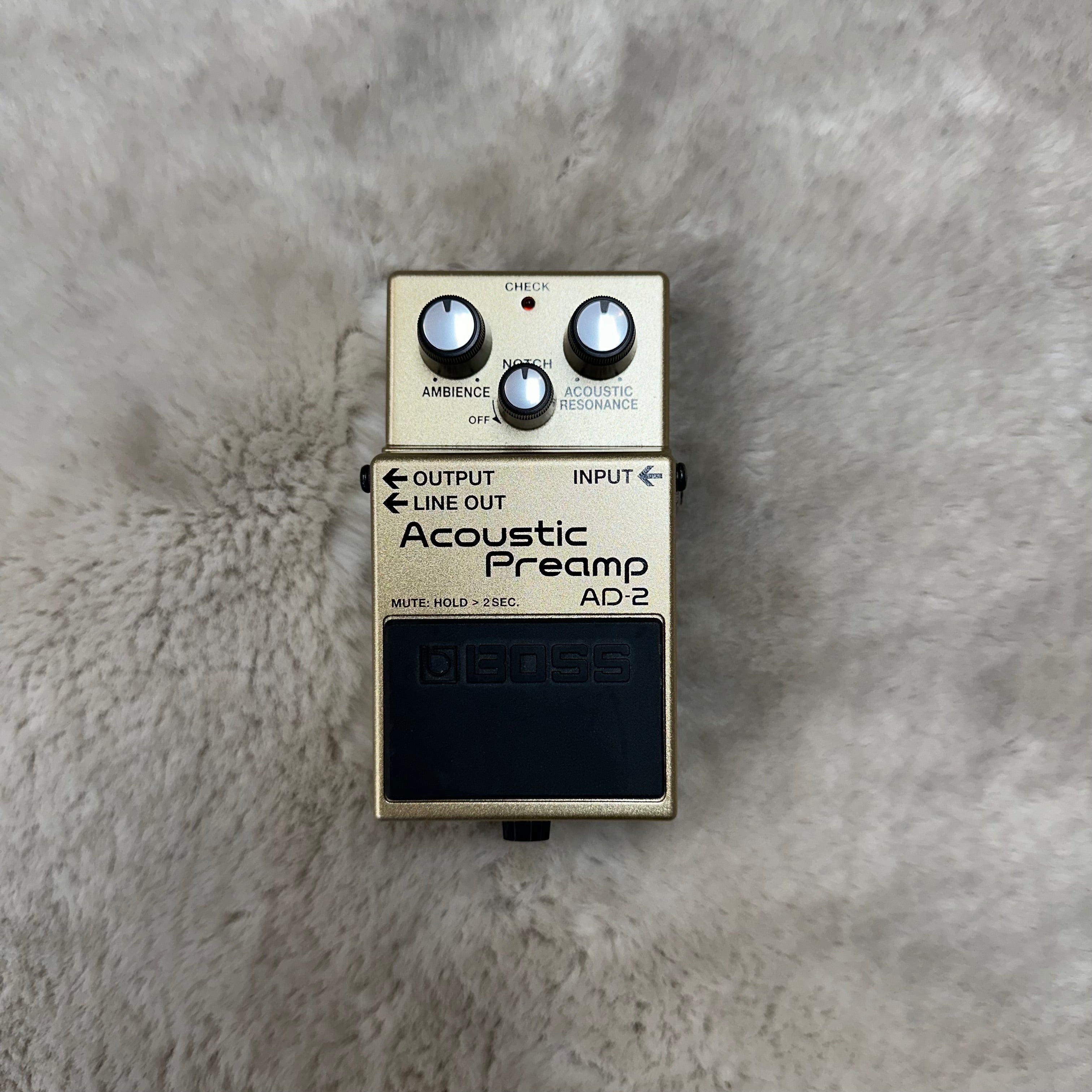 "With the AD-2 Acoustic Preamp, acoustic-electric guitarists can now experience natural, studio-quality sound while performing on any stage. Equipped with an advanced BOSS sound engine, this compact pedal packs sophisticated processing power that belies its small size and simple, intuitive interface. Acoustic Resonance reproduces the complex resonance characteristics of your unplugged tone, while Ambience provides pro-level reverberation perfectly optimized for acoustic guitar. The AD-2 also features essential stage tools such as a notch filter for feedback control, a balanced DI out for direct connection to a PA, and a convenient mute function for tuning and switching guitars." -Boss