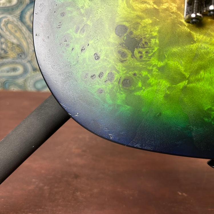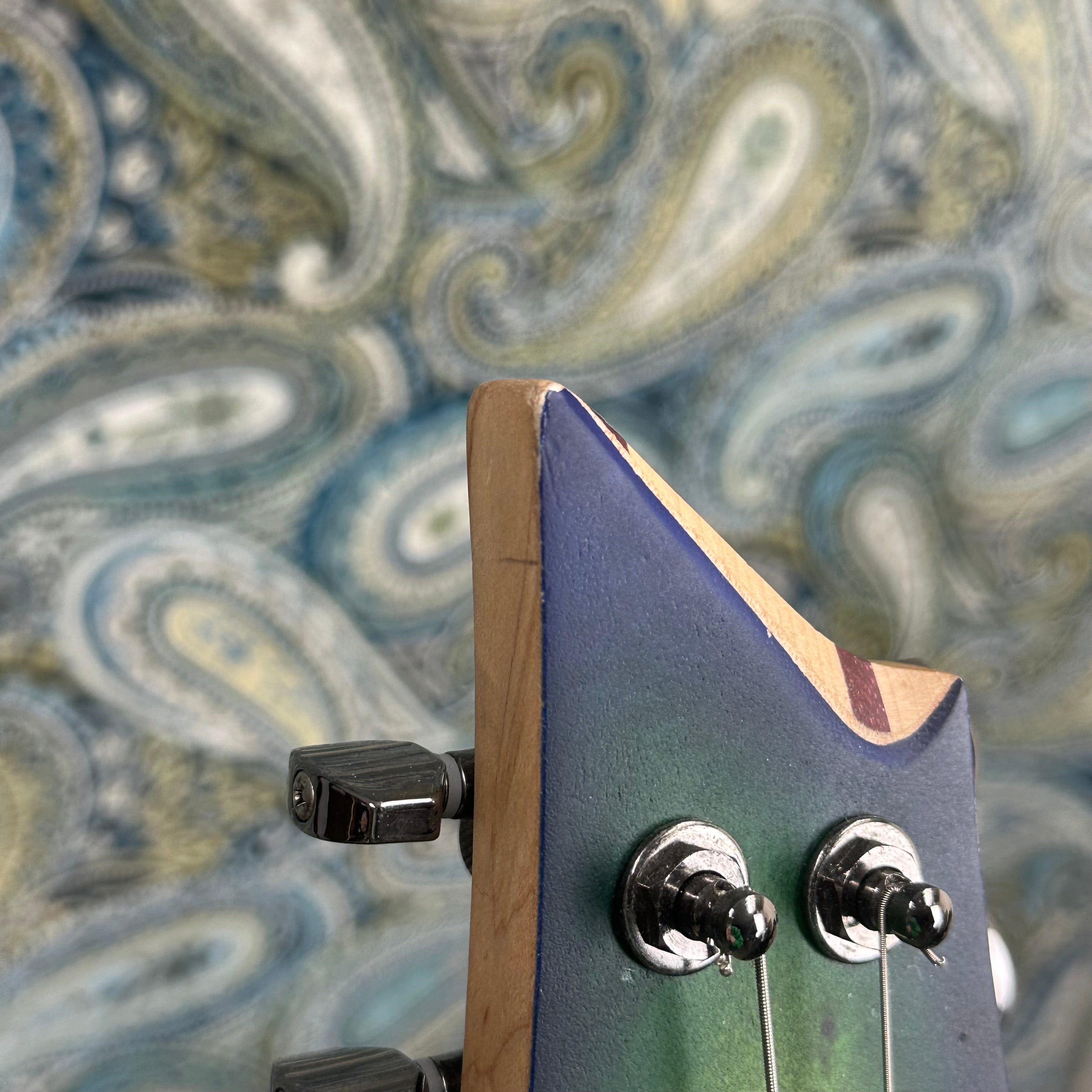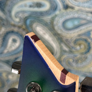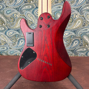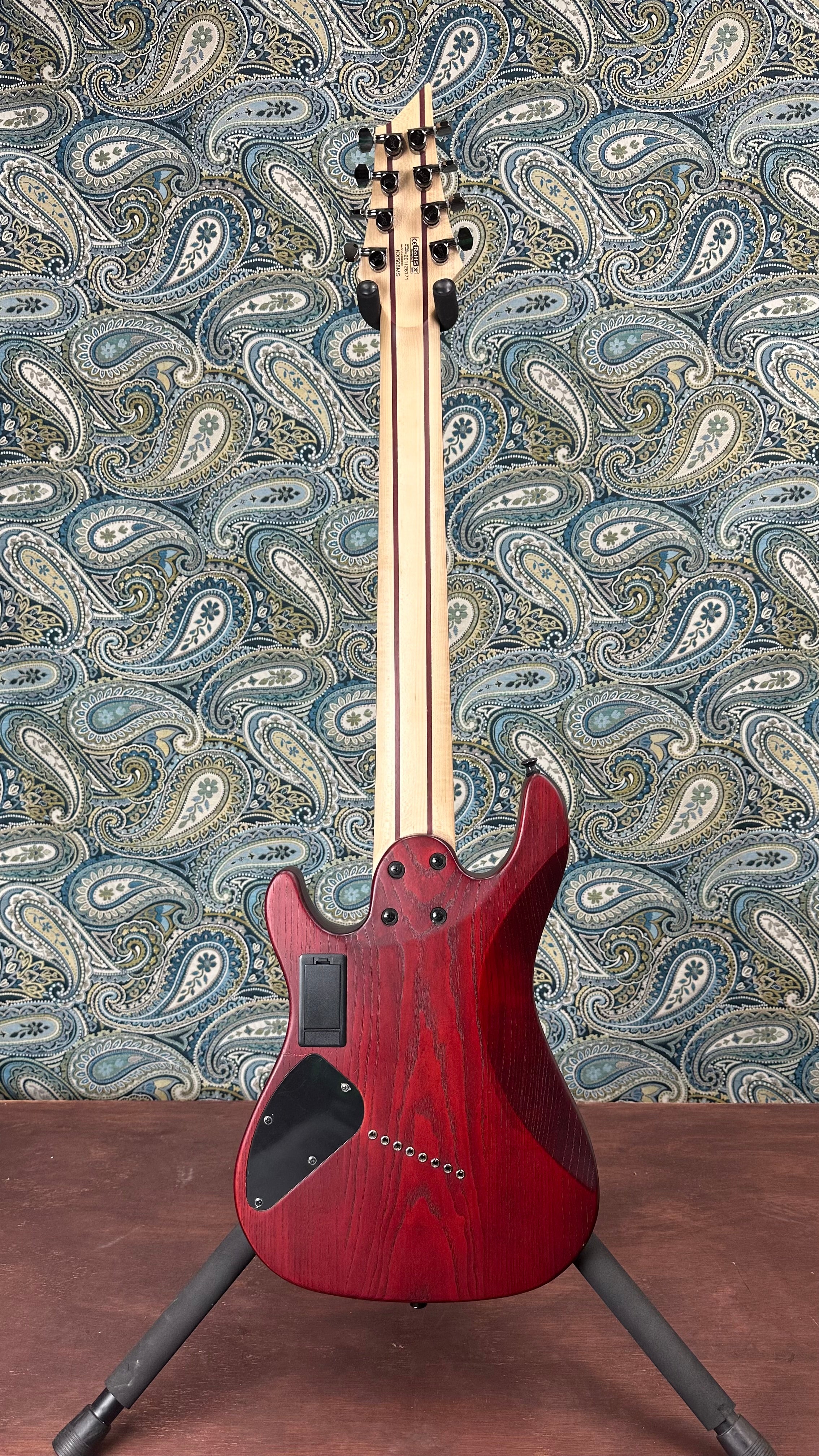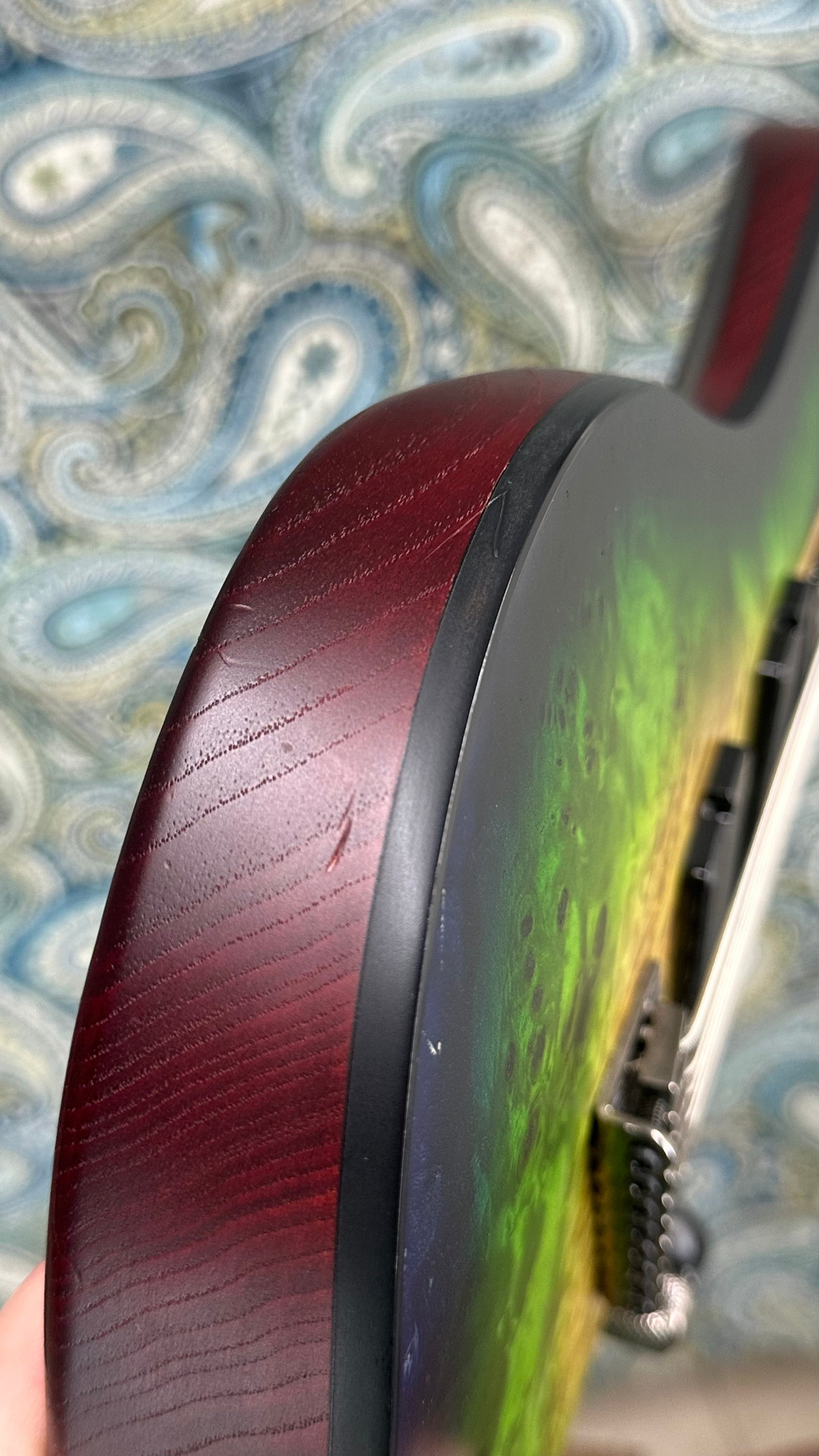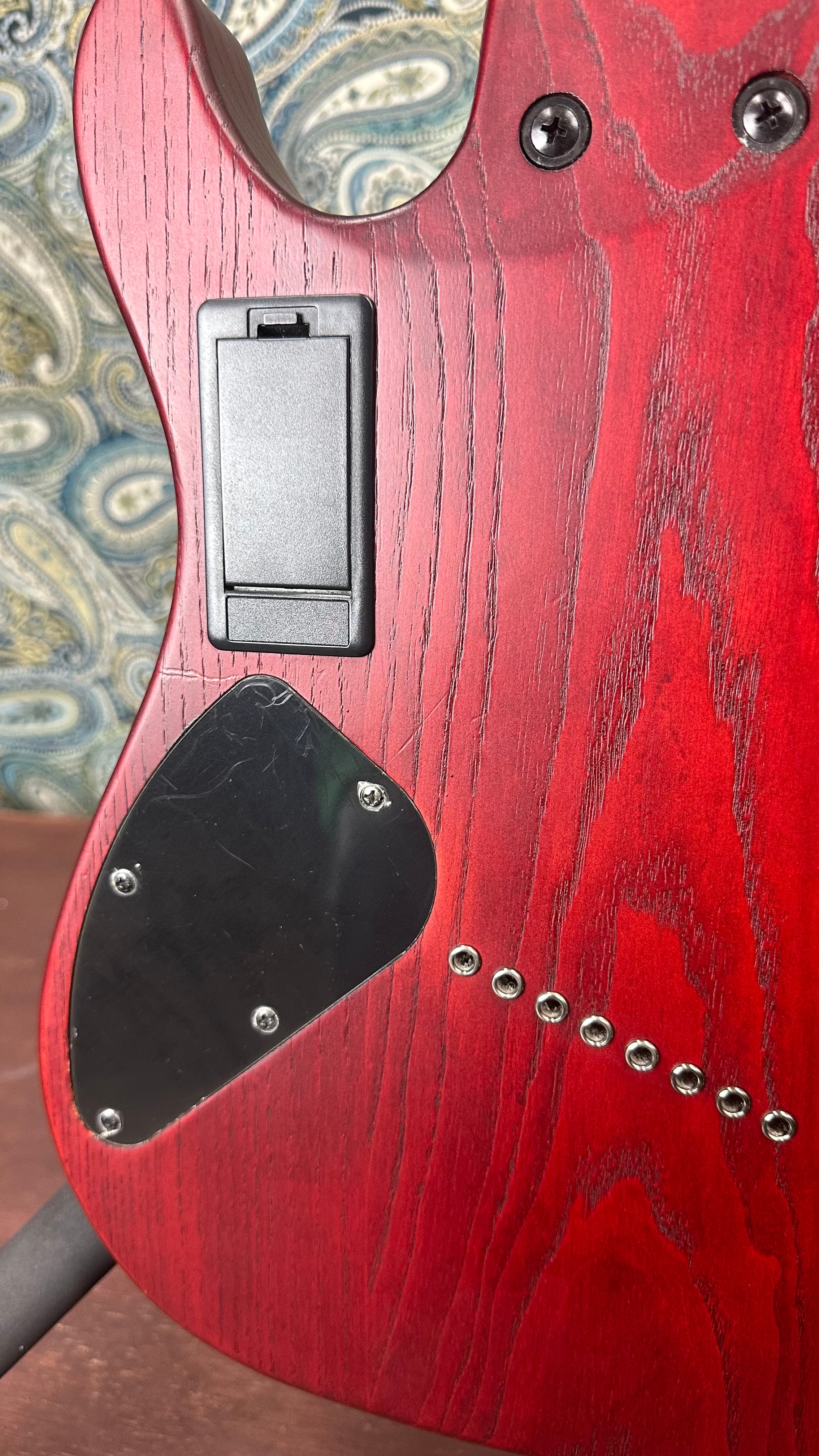 This guitar is in good shape with some fair signs of wear throughout the guitar. There are a few small nicks and dings, we've photographed them to our best ability. Namely, a few on the pointy headstock, and a small gash near the battery and backplate. Nothing too distracting, but worth noting. This guitar is extremely comfortable to play. The multi-scale allows easier stretches across the fretboard. If you're looking for a reasonable entrypoint to multi-scale guitars, this is hard to beat!