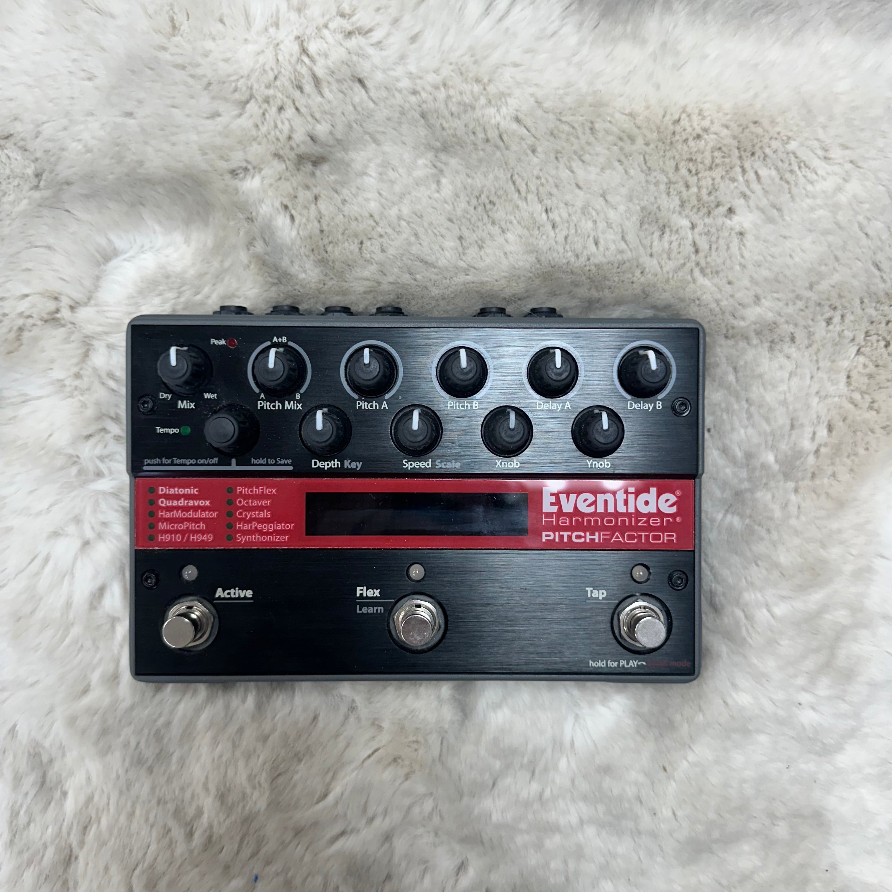 "The PitchFactor Harmonizer pedal gives you Eventide's 10 best pitch-changing effects from the past 36 years without compromising quality or flexibility. This plug-and-play expression pedal gives you control over the wet/dry mix or any combination of parameters. Control program changes and vary parameters continuously via MIDI. The Pitchfactor Harmonizer supports instrument or line-level inputs and outputs.