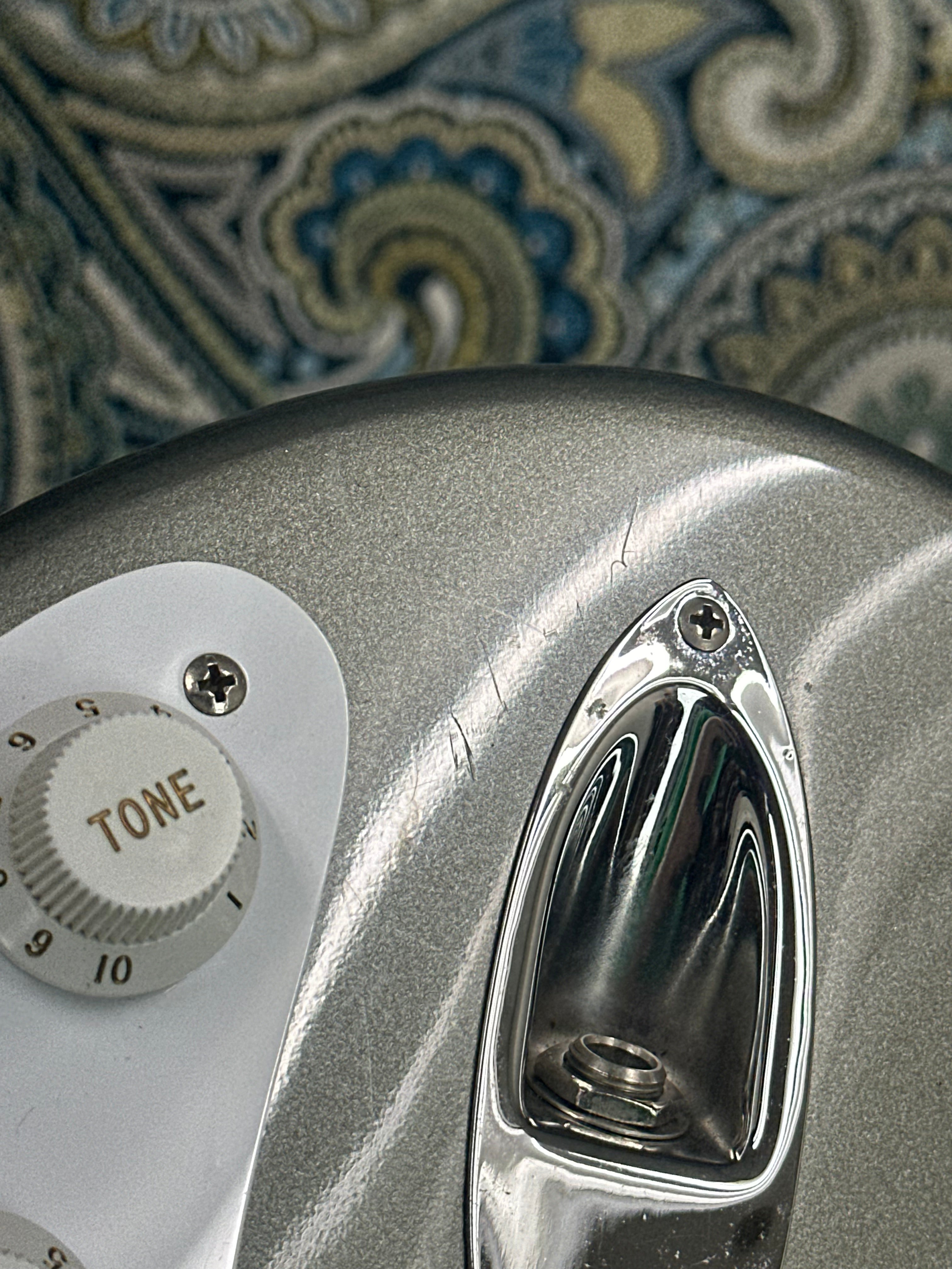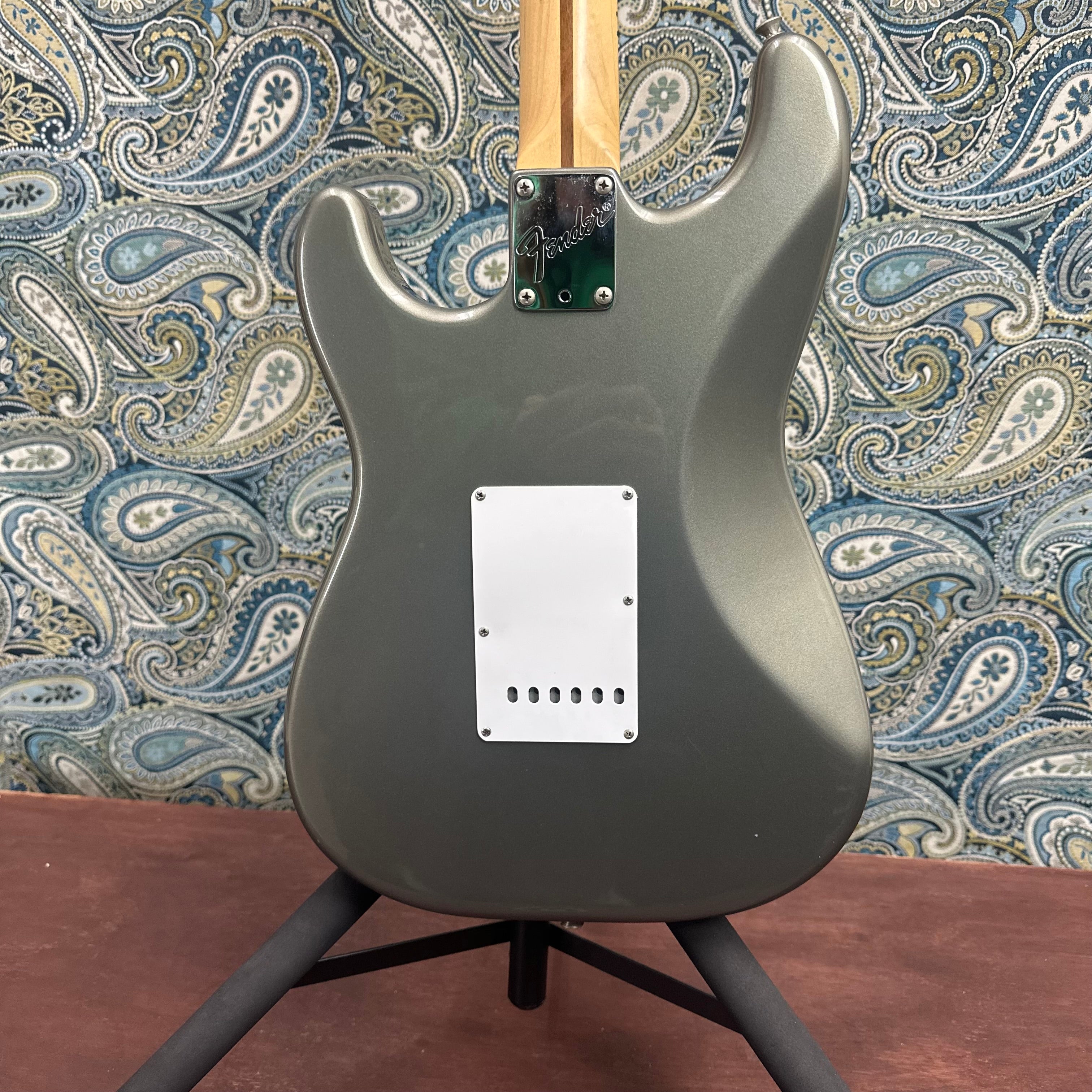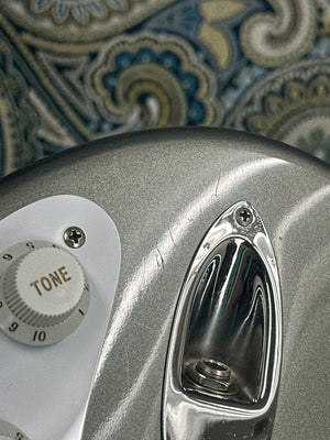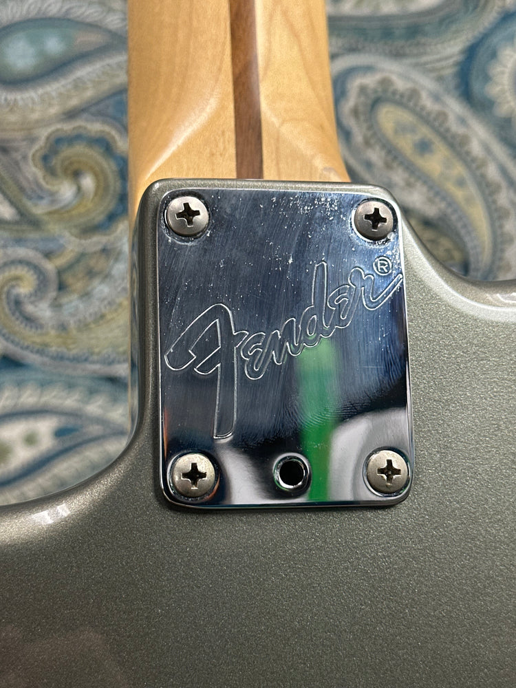 The pewter gray has a subtle sparkle, and is extremely uncommon to see in the modern Fender catalogue. This guitar has a few blemishes as pictured, but other than that its in great shape. There is general scratching throughout the pickguard and on to some of the pickup covers. There are a few small nicks in the finish as pictured. Additionally, there is a U-Shaped finish crack near the heel of the neck joint. You can catch it with your fingernail but poses no structural issues. The headstock has some slight marring between the bass string tuner and the nut. She's a beaut!