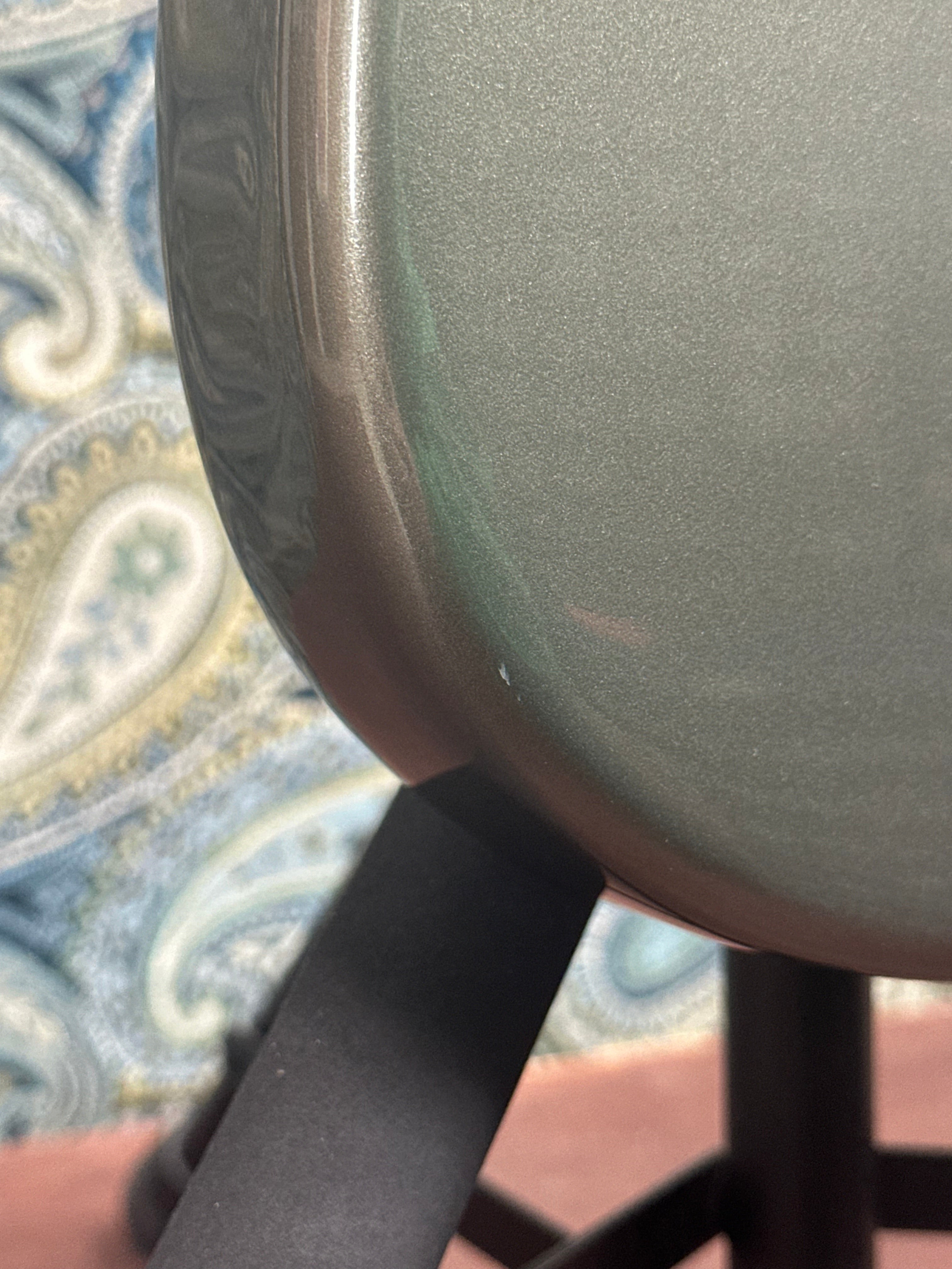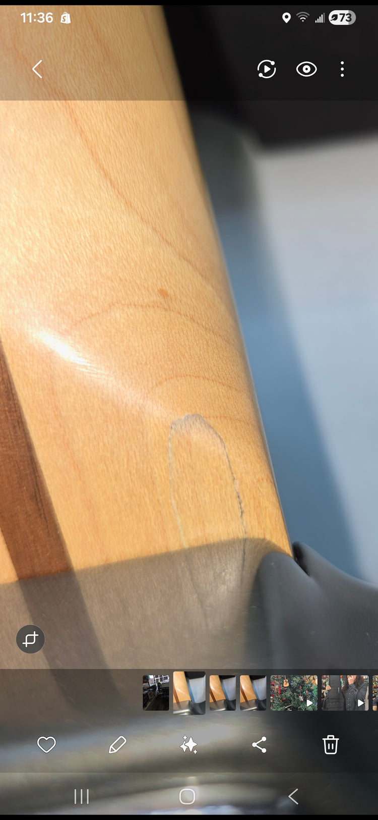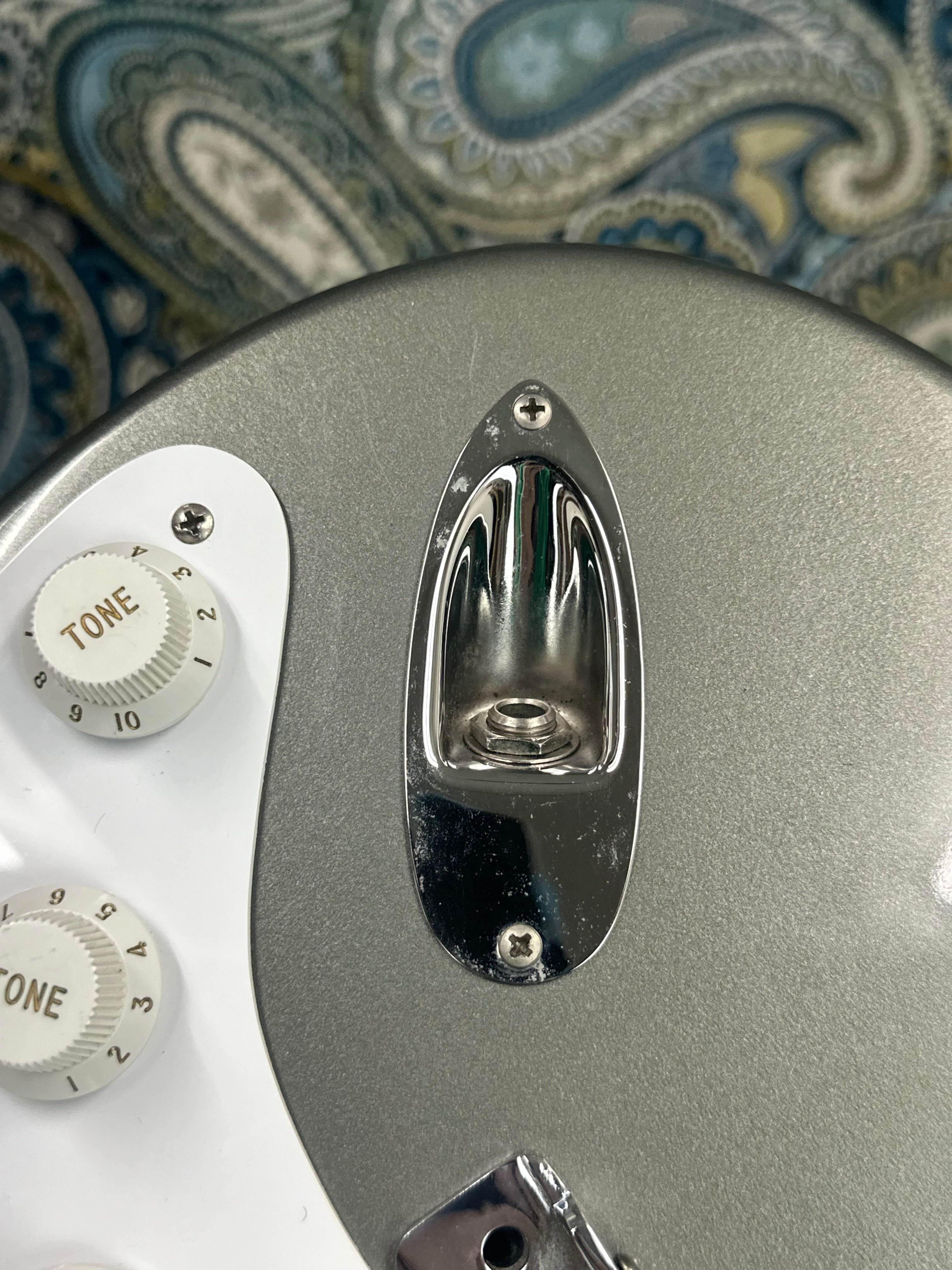 The pewter gray has a subtle sparkle, and is extremely uncommon to see in the modern Fender catalogue. This guitar has a few blemishes as pictured, but other than that its in great shape. There is general scratching throughout the pickguard and on to some of the pickup covers. There are a few small nicks in the finish as pictured. Additionally, there is a U-Shaped finish crack near the heel of the neck joint. You can catch it with your fingernail but poses no structural issues. The headstock has some slight marring between the bass string tuner and the nut. She's a beaut!