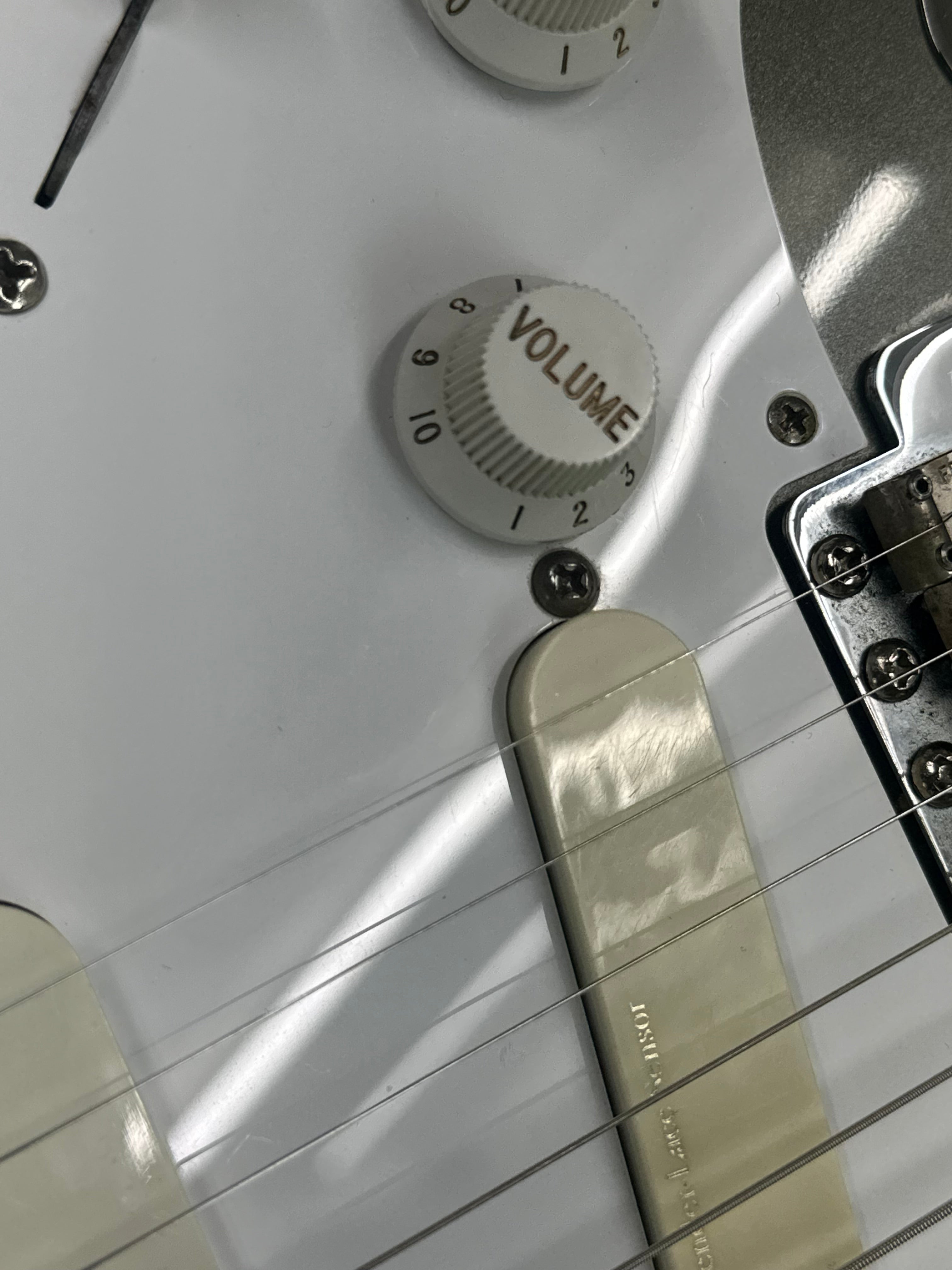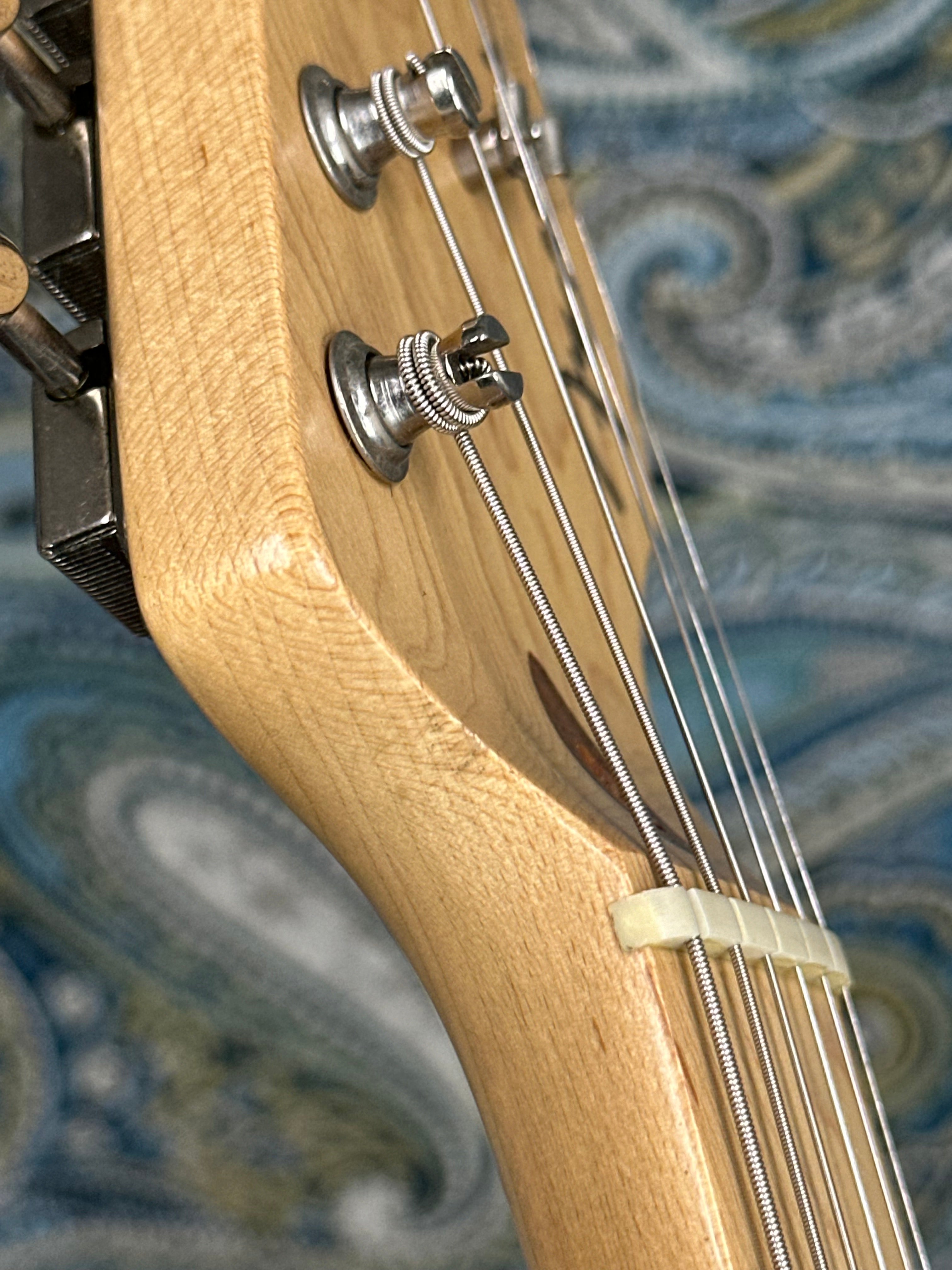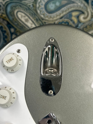 This guitar has a soft “V’ shaped maple neck with skunk stripe down the back. It has a nice maple fingerboard with black dot inlays and a 1 5/8” nut. The vintage-style nickel tuners are in good shape. The 6-point trem has been blocked, and while the bar is included, it is not usable without a setup.