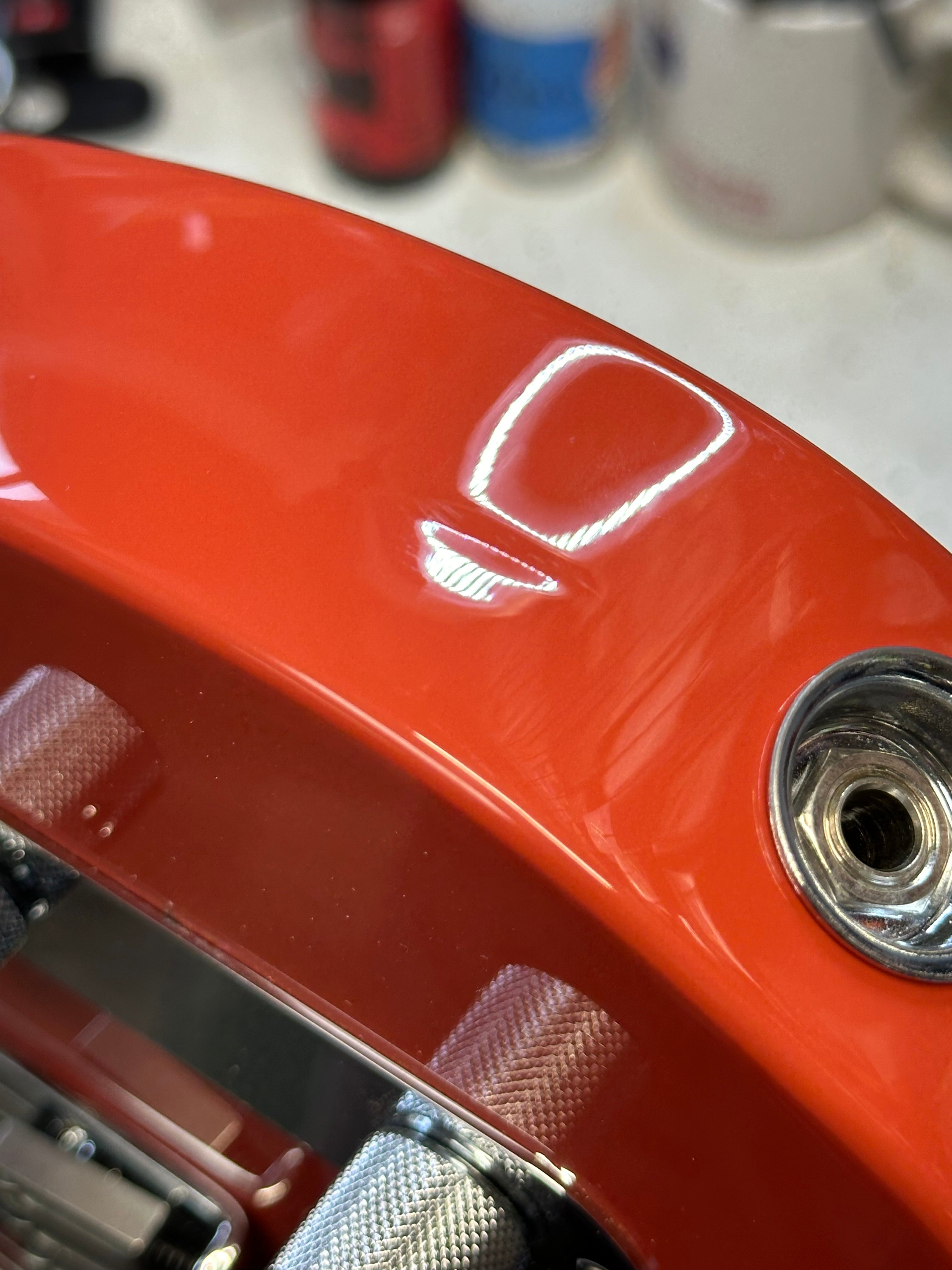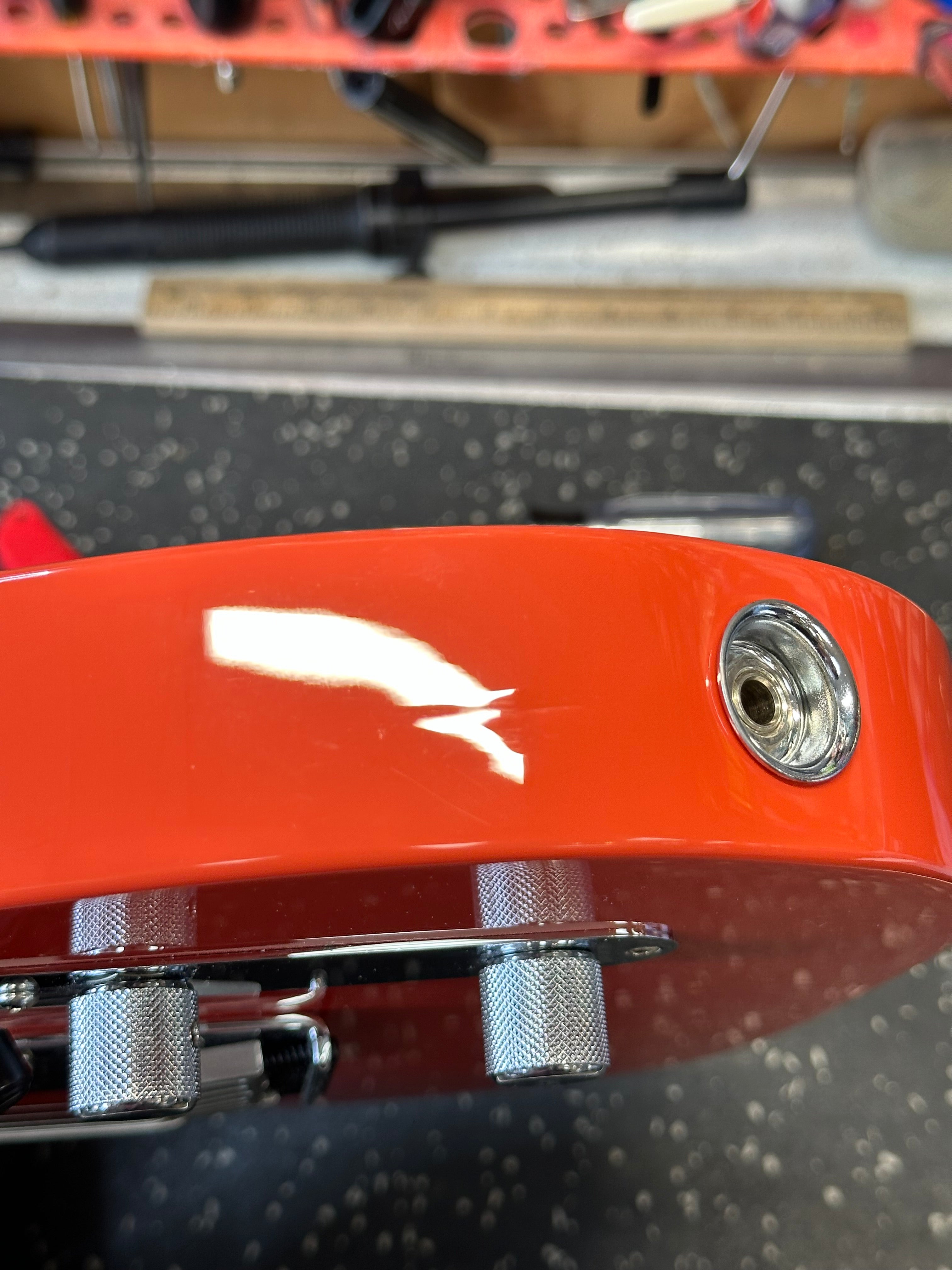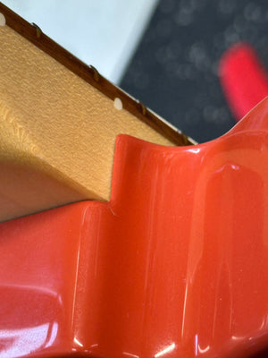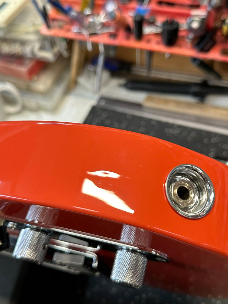 This guitar is in really solid cosmetic shape but there are a few nicks and cracks that aren't in visual hot spots. We photo'd this one crack/ding from a few different angles. It is on the bottommost bout of the body and not visible from any other angles. A little difficult to capture on film, but it is a ripple in the finish with a slight indentation. Probably dropped on it. There are also a few small finish cracks in the neck pocket. Doesn't impact playability.