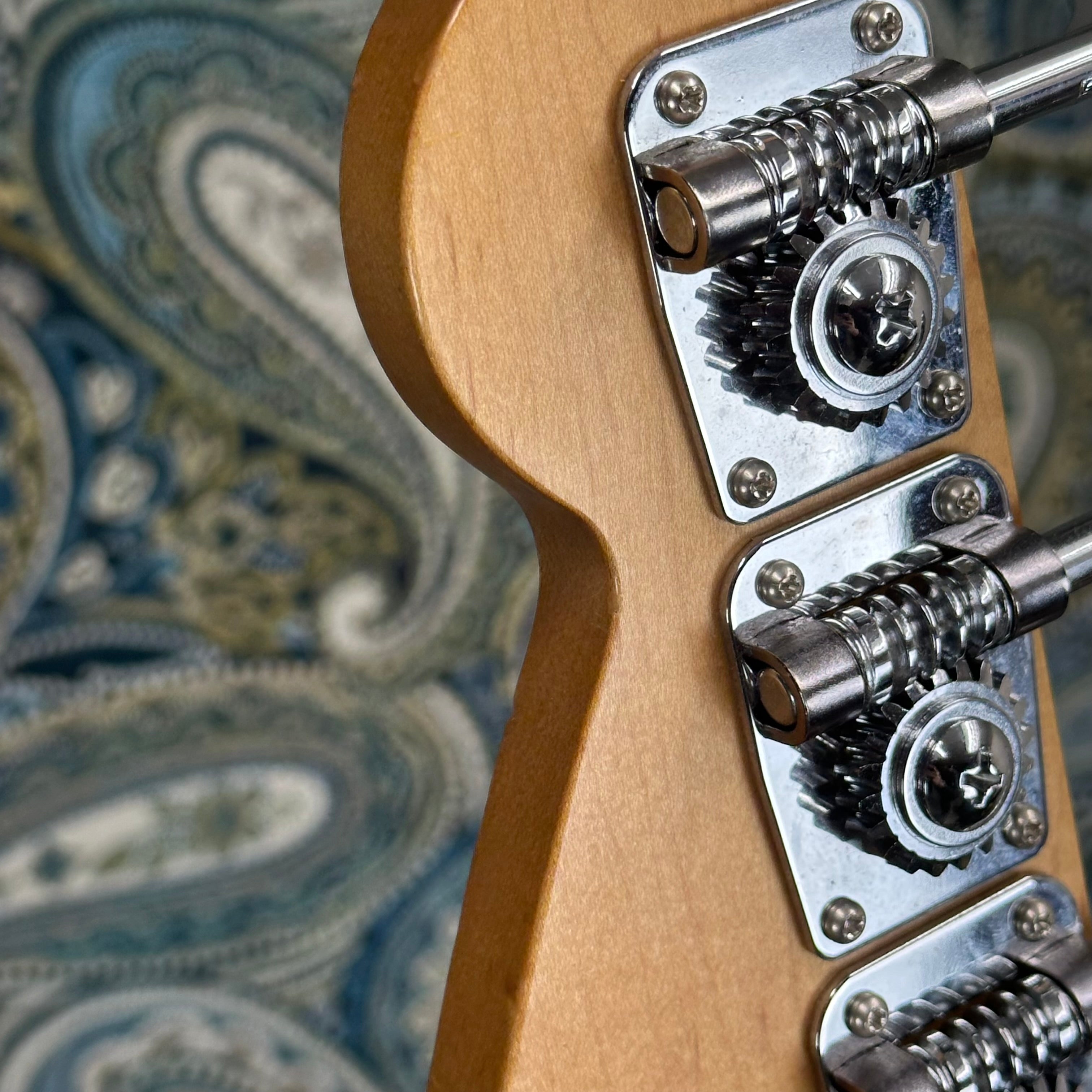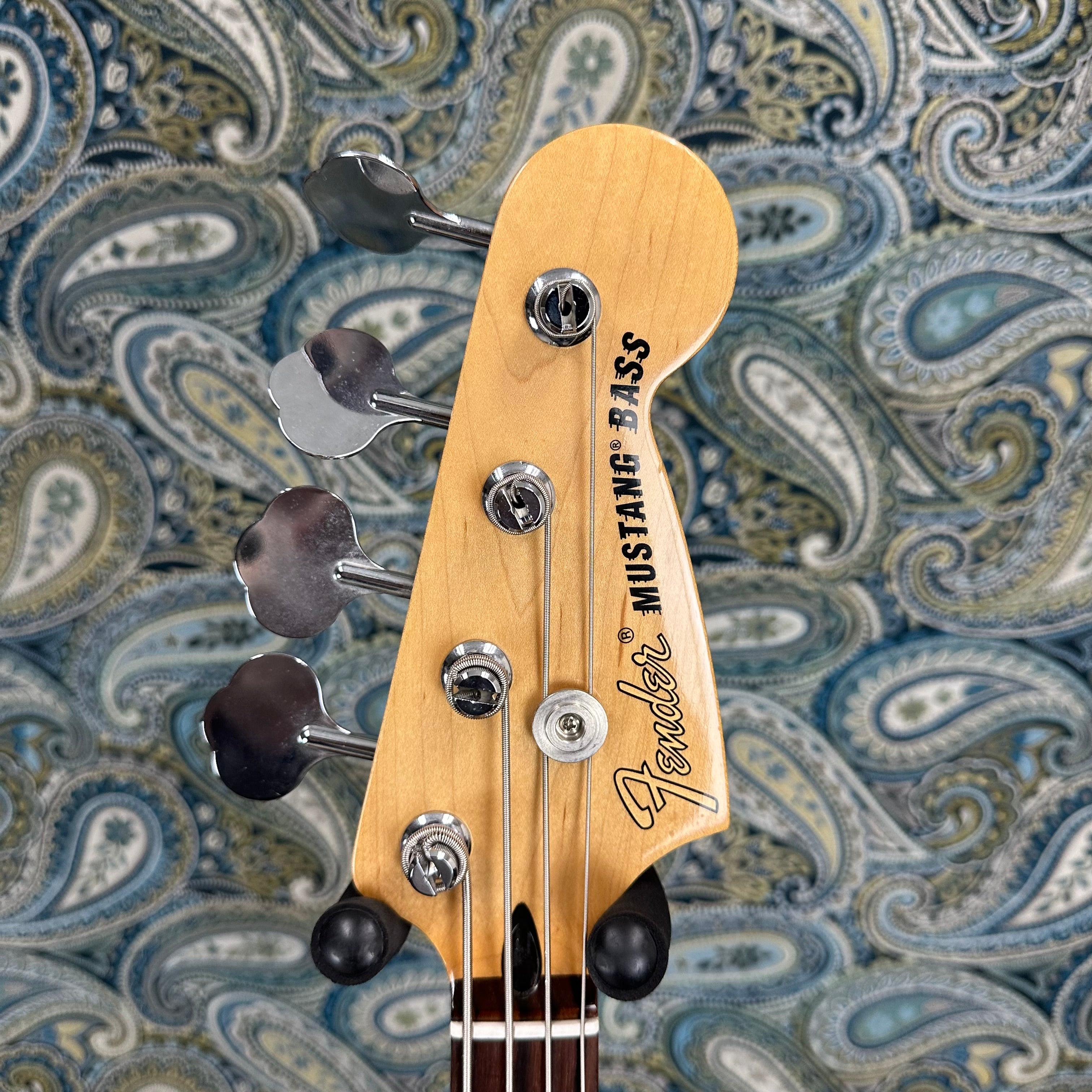 "Powered by a time-tested pair of pickups, the Mustang Bass PJ is packed with flexible tone that can match any sonic requirement. A punchy split single-coil P Bass® middle pickup is joined by a growling Jazz Bass neck pickup in an unbeatable pairing that combines the best of both sonic worlds. Master volume and tone controls, along with a conventional three-way pickup switch get you to all available sounds. Not only is the 30" scale more comfortable for smaller hands, it reduces string tension, creating a looser playing feel that lends itself to nimble playing styles while adding a fat, "blooming" quality to the lower notes and sweetening the higher notes. Topped by a 9.5"-radius Pau Ferro fingerboard with 19 medium jumbo frets, the "C"-shaped maple neck is comfortable for all playing styles." -Fender