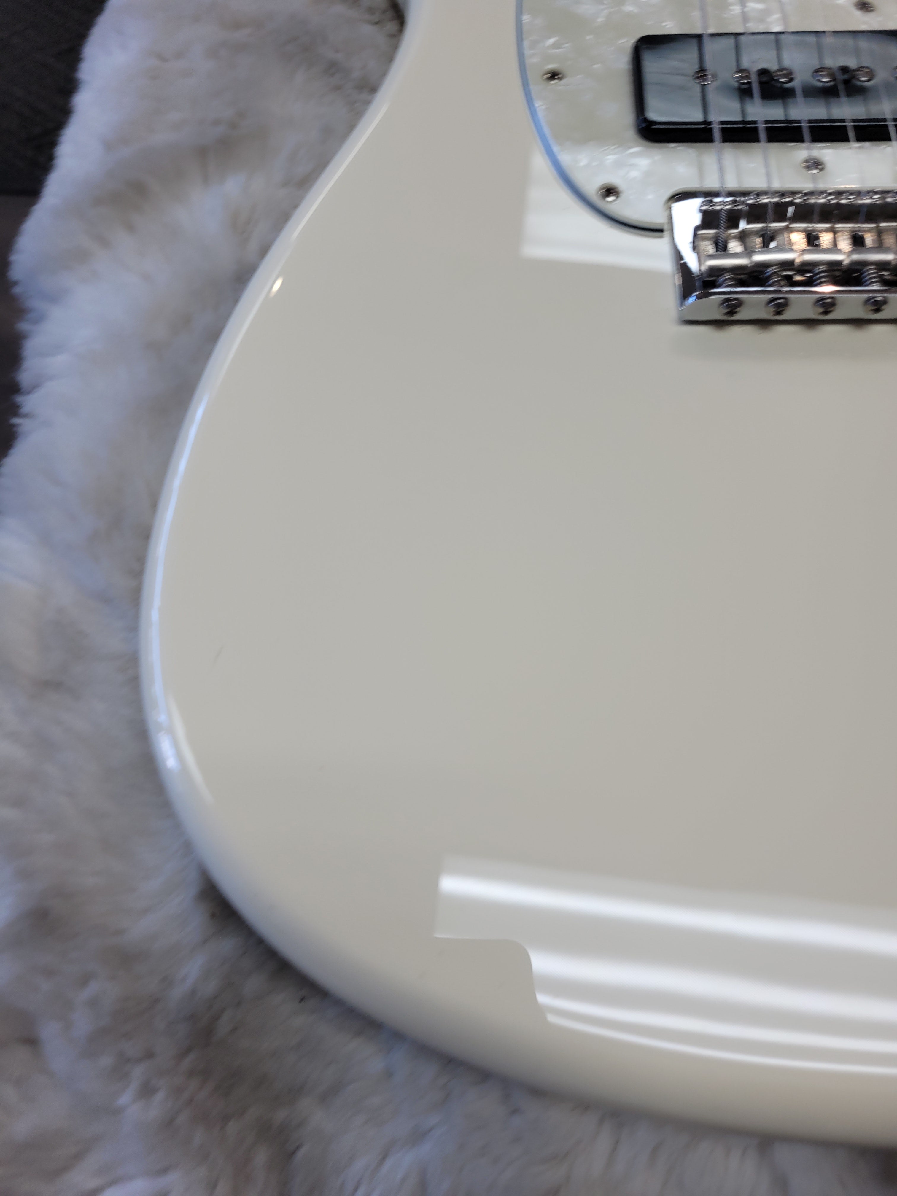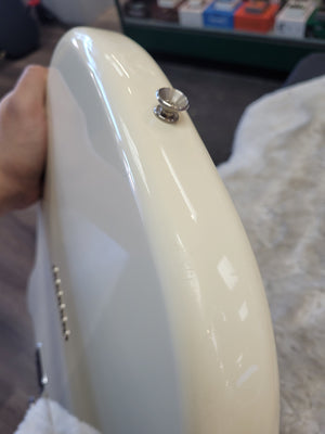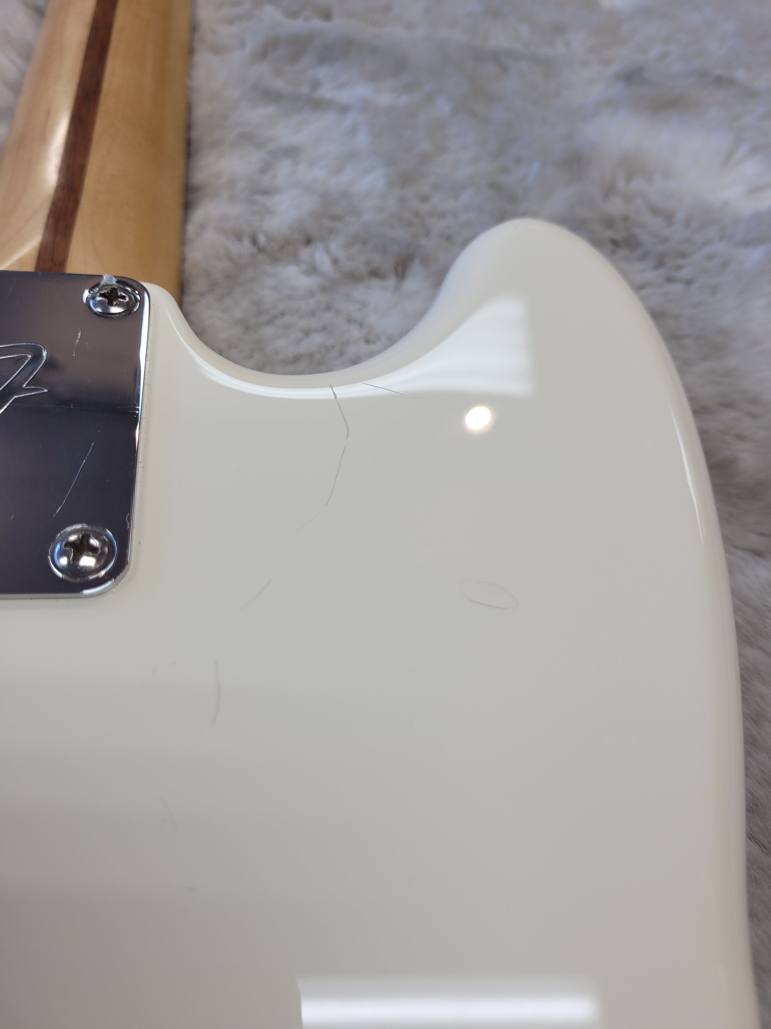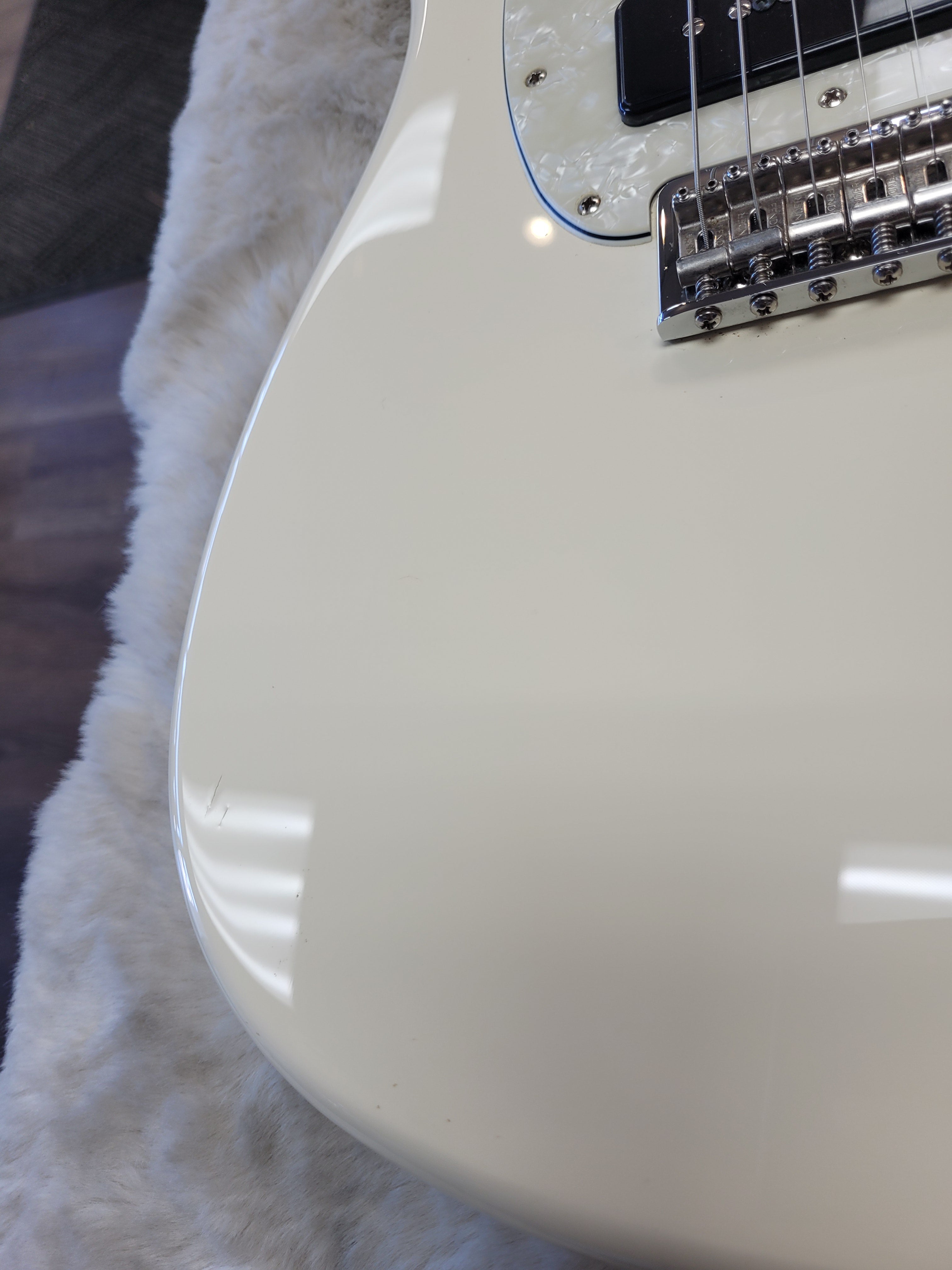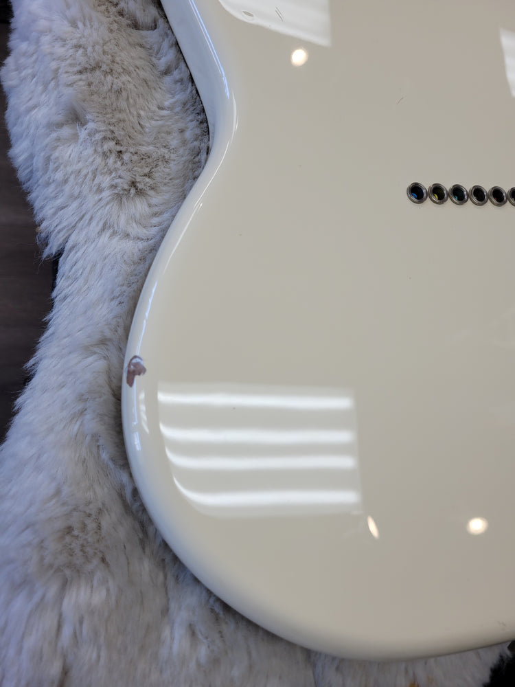This guitar has a lot of the wear you would expect on a white guitar that's a decade old. There are numerous small scratches, scuffs, and dings that we tried to photograph to the best of our ability. After it's first year of production (2016), the fretboard changed from rosewood to pau ferro. Since this is a 2016, you don't have to worry about that! If you're looking for an all-out, no frills, Rock 'n' Roll machine that's seen some battle scars, this is the axe for you!