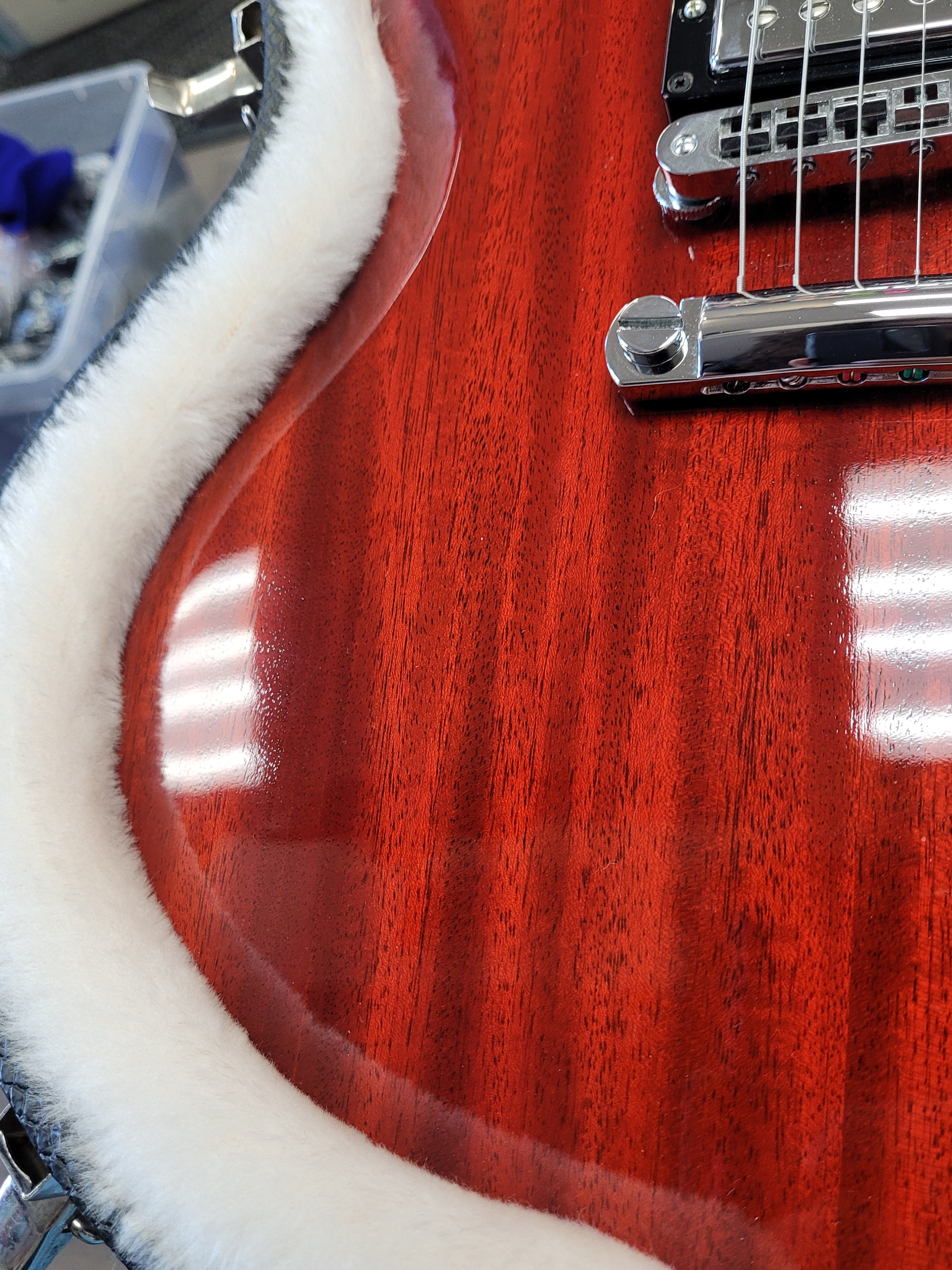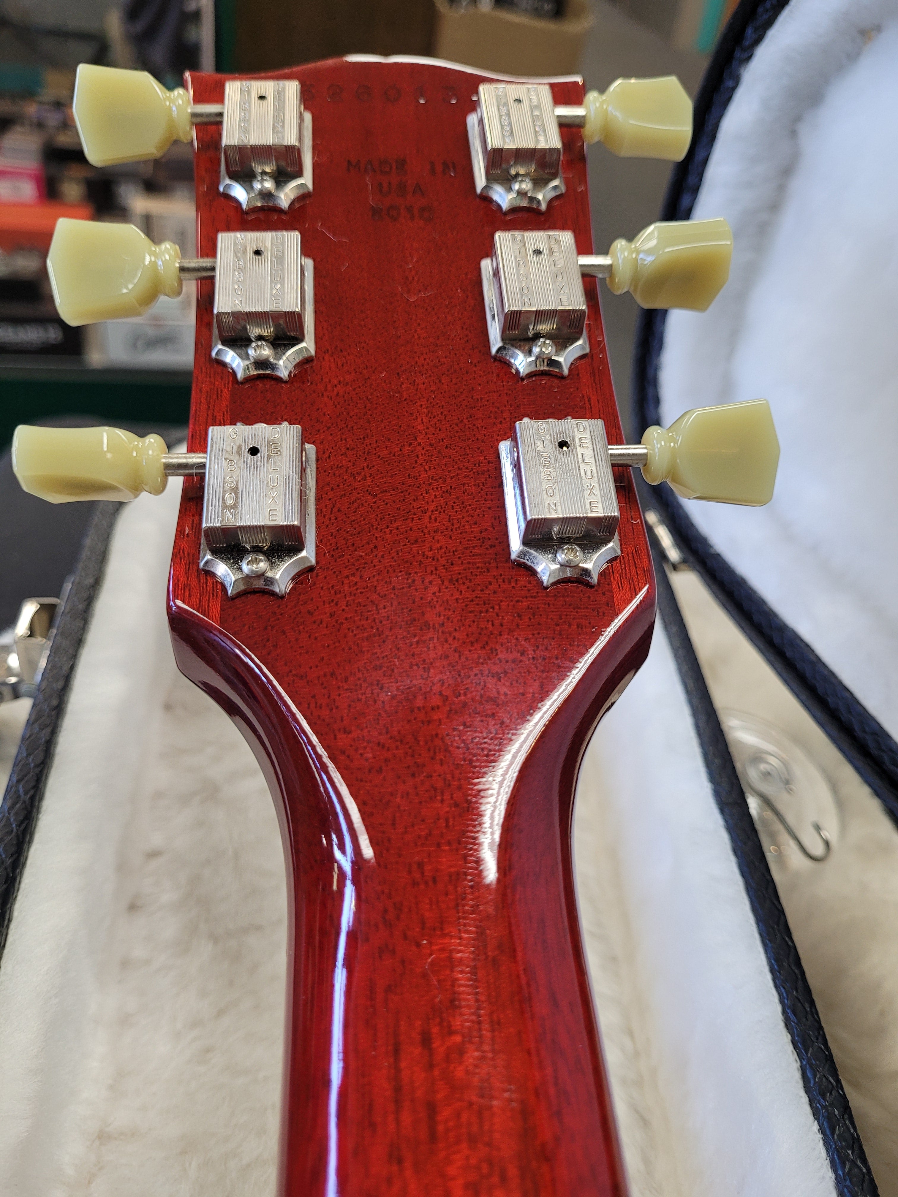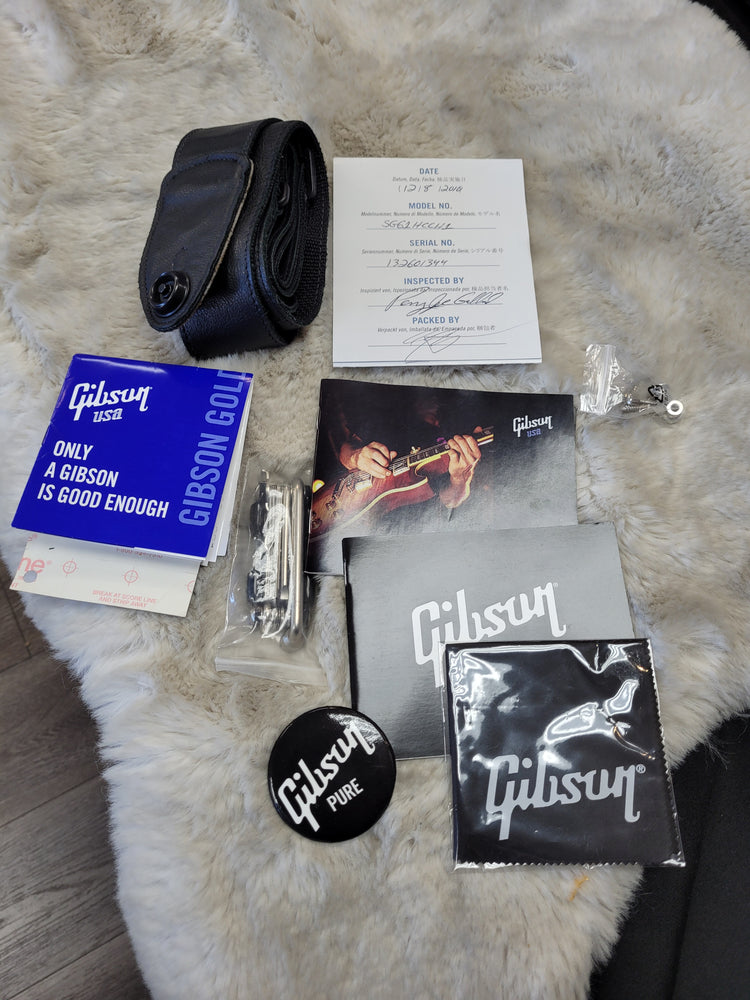 For a 15 year old guitar, this is in phenomenal shape! There's a very small indentation on the body near the bass side of the treble pickup. Other than this, there are a couple of small scratches near the controls and input jack. Incredibly clean! The stock strap buttons have been replaced with black Dunlop strap locks that also double as strap buttons. Comes with Gibson hardcase, case candy, and a strap with the other ends of the straplocks