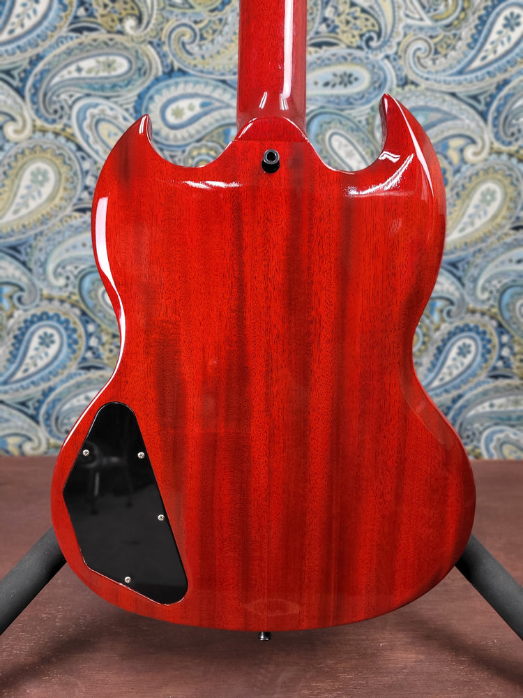 The SG Standard ‘61 returns to the classic design that made it relevant, played, and loved – shaping sound across generations and genres of music. In 1961, the Les Paul™ model was put on hiatus, and an all-new design evolved into what is today known as the SG™ or “solid guitar.” The Gibson SG Standard ‘61 retains the styling of the legendary original models from the early 1960s. It features a solid mahogany body with the classic double-cutaway SG shape, complete with the iconic deeply sculpted body scarfing and double horns that make this model instantly identifiable. Gibson included two highly accurate PAF-style humbuckers in the redesign, but with wax coating and a poly-coated wiring that will kill feedback dead.