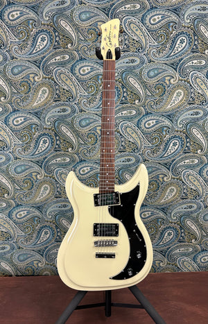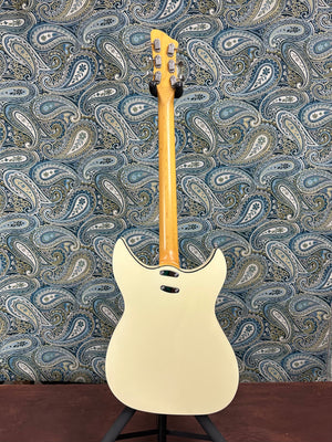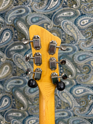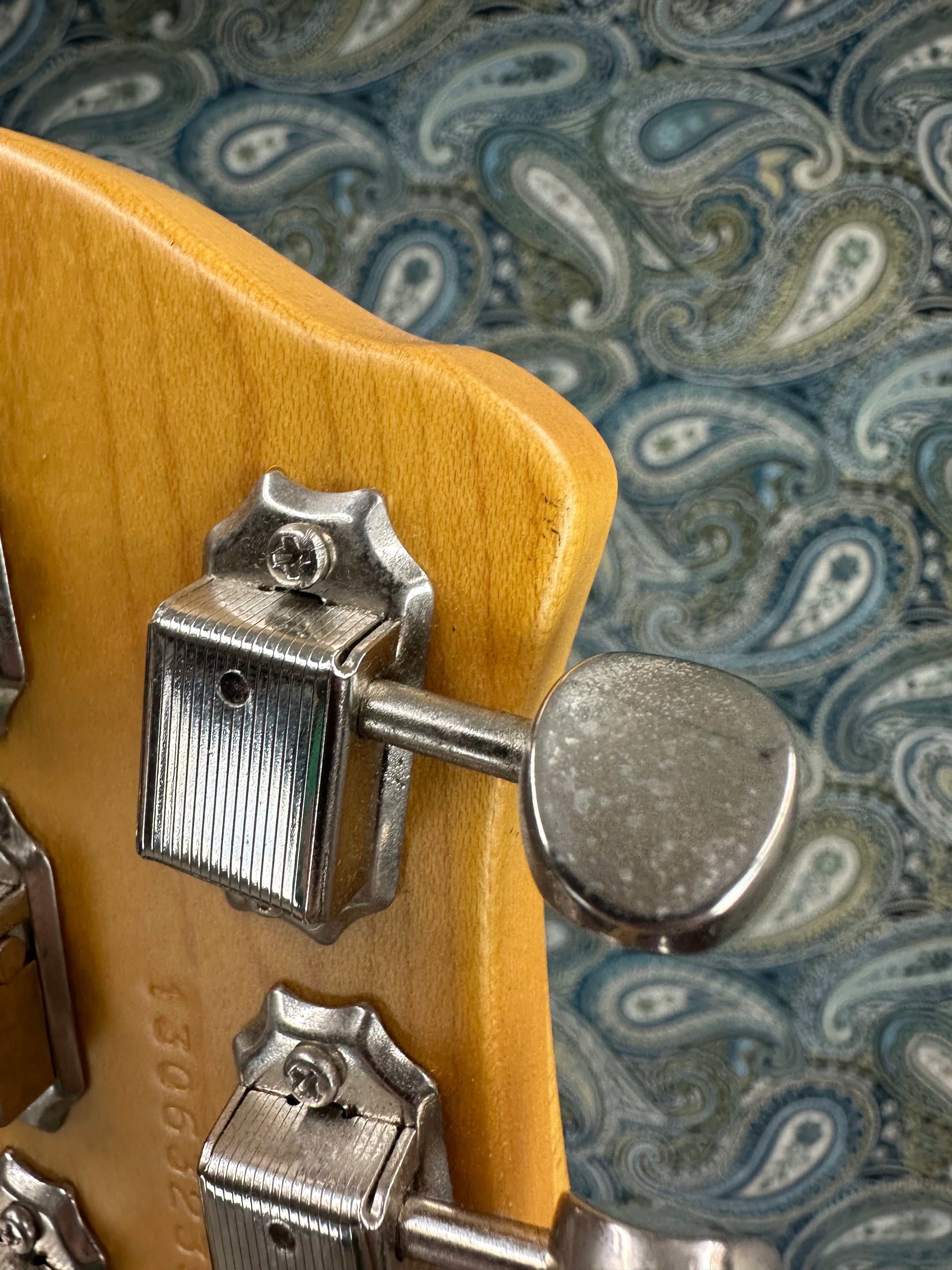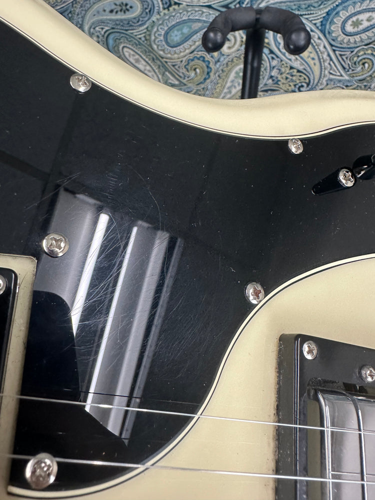 This guitar has the wear you would expect on a 10-year-plus instrument. There are no major dings or scuffs on the instrument. There are a few light scratches throughout, with the majority of them being on the pickguard. There's also some very slight weathering on the tuning pegs which adds to the vintage look of this guitar. The knobs have been replaced with a pair of Rickenbacker bass volume knobs. The master volume knob says "Treble Volume" and the master tone knob says "Bass Volume". This guitar weighs 7LBS 12oz.