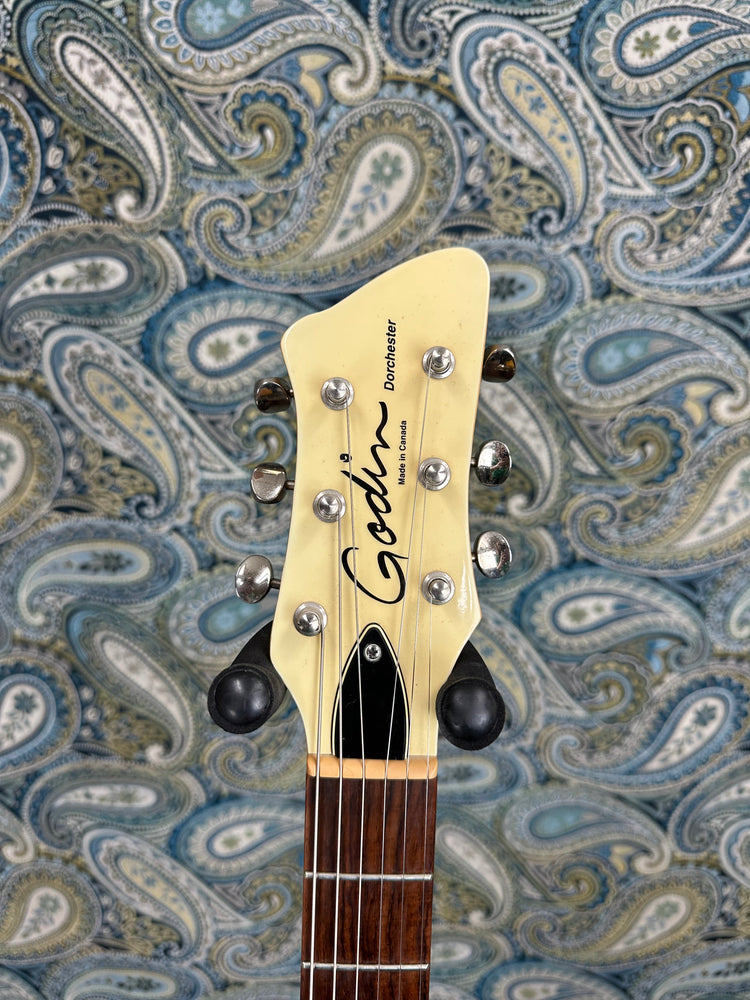 The Dorchester model has a unique, futuristic look that gives a nod to the classic retro designs of the late fifties and early sixties. Even though it looks retro, this axe is forward thinking and futuristic. To maximize the tonal response, the designers at Godin selected a unique blend of tone woods for this model, which features an offset, double-cutaway chambered body with a silver leaf maple body center with poplar wings. Combined with a bolt-on maple neck and a 25-1/2" scale rosewood fretboard, provides the platform for each tone wood to exhibit its best attributes. The Lace Sensor Alumitone passive humbuckers have the best of both classic humbucker and single coil tones through the use of a 4-way switch.