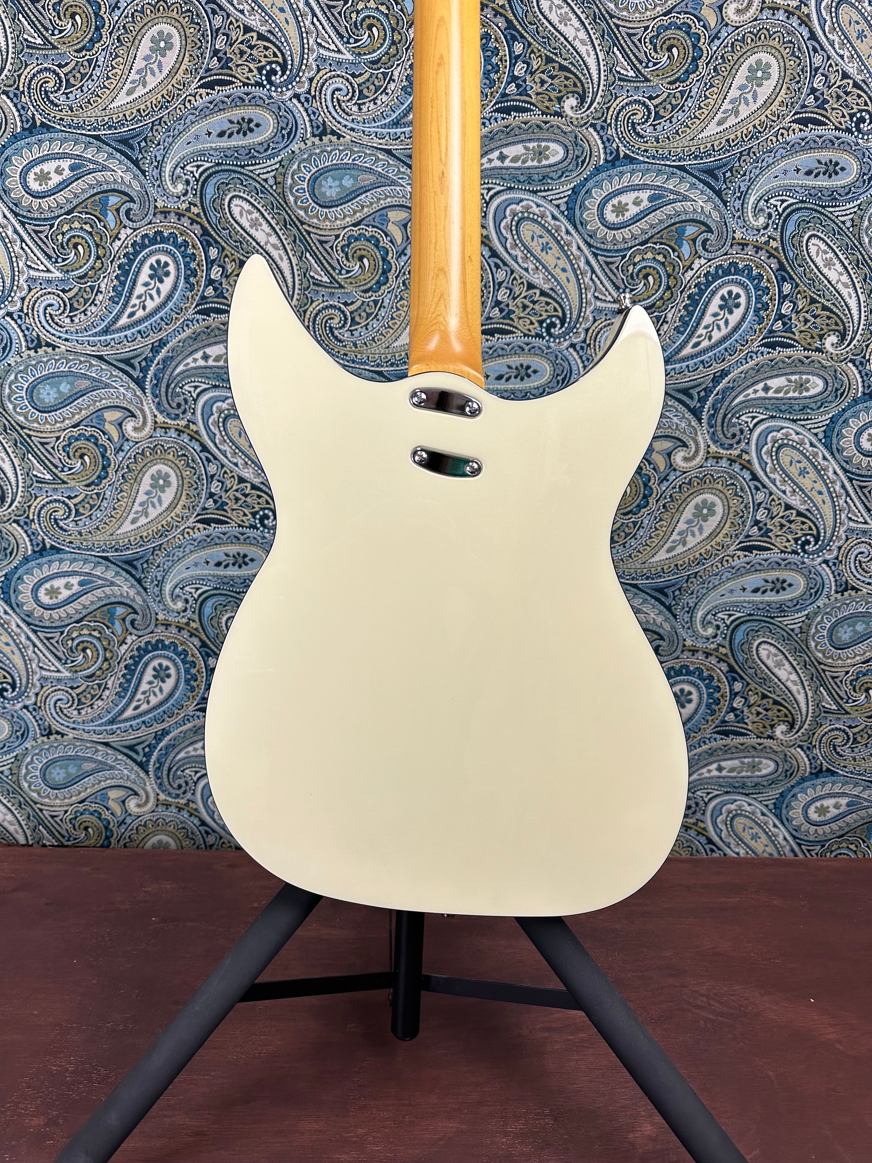 The chrome roller bridge fits the classic vibe and modern function of this guitar. The strings are anchored in a 3-screw tailpiece that feeds a fully adjustable bridge assembly with rounded chrome saddles. The Kluson 14:1 tuners will keep you playing in tune. The neck is attached to the body at the 20th fret with four screws through a pair of neck plates, providing the benefit of excellent upper fret access. The satin finished, medium-large C-shaped, tapered neck, combined with a 12” fretboard radius and medium jumbo frets, makes for a very comfortable playing experience.