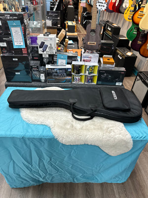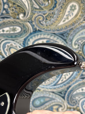 This guitar is in pretty good shape, but there is some thin swirling and scratching throughout the body. This thing has been played. We have pictured the scratches to our best ability, but the guitar is fully functional and plays like a dream! The frets have lots of life left in them and the electronics give this guitar a total leg up on your papa's axe. Comes with battery pack charger and gigbag.