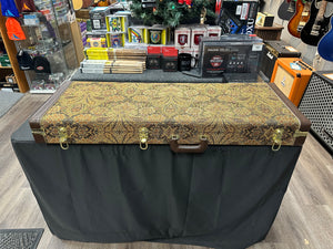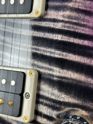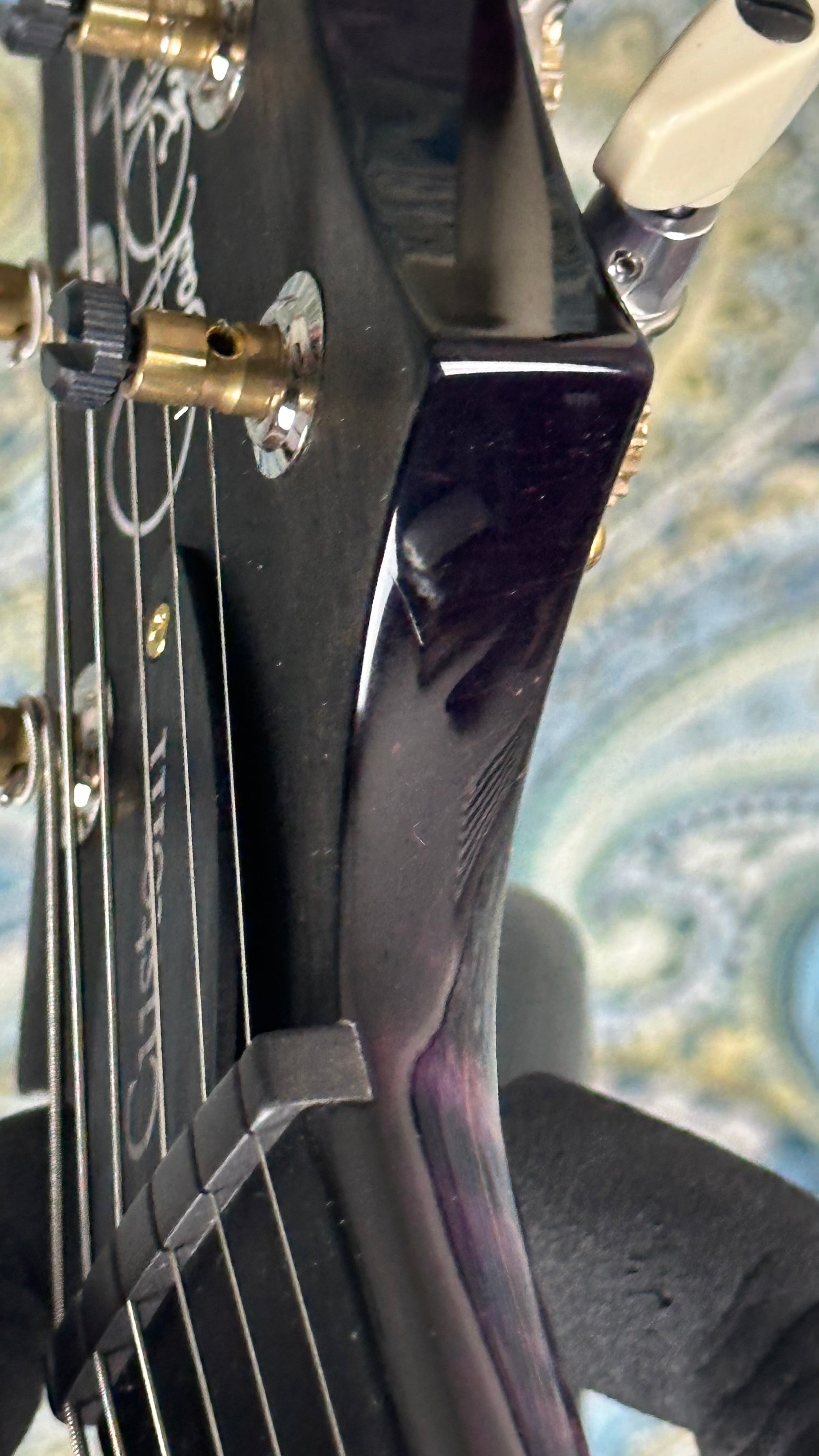 This guitar is an absolute stunner! Check out the flame on that neck! Photos don't do the flame-maple top justice, it's totally three-dimensional! This instrument is in very good shape with some minor signs of play wear. There are thin finish scratches throughout the guitar (as pictured). There is also a bit of corner rashing near the input jacks on the back of the body. The strap buttons have been upgraded to locking Dunlops, with the originals included in the case. The topmost corner of the headstock has a minor blemish as shown. There is also some surface scratching on the face of the headstock.